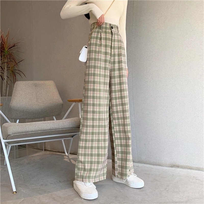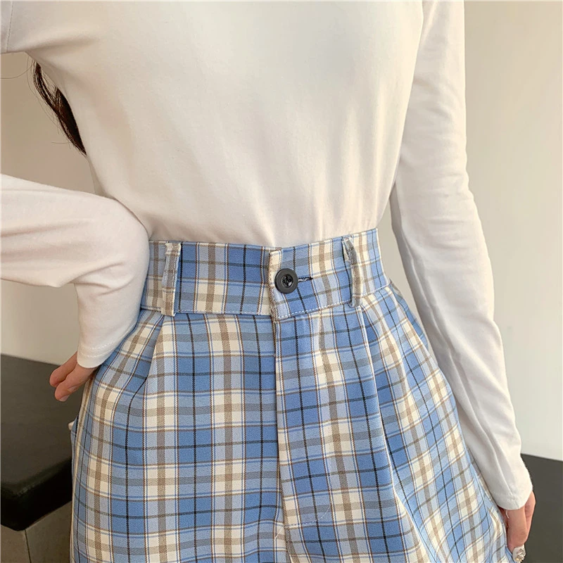 Женские прямые брюки, повседневные свободные брюки в синюю клетку, с широкими штанинами, на пуговицах, в Корейском стиле, уличная одежда, осень 2021