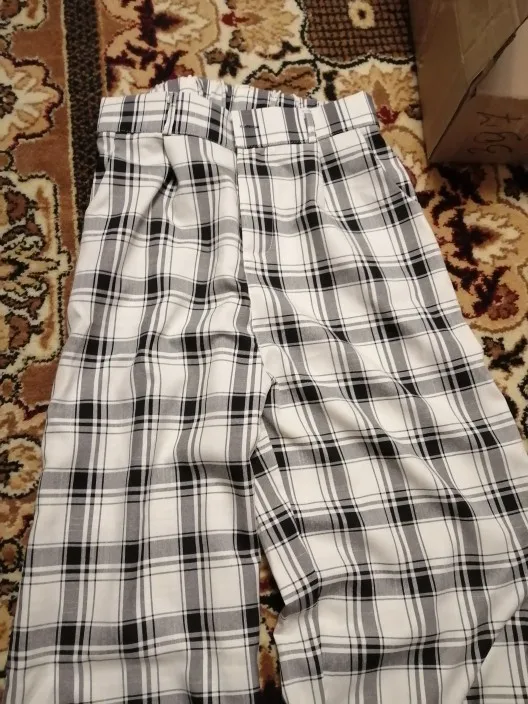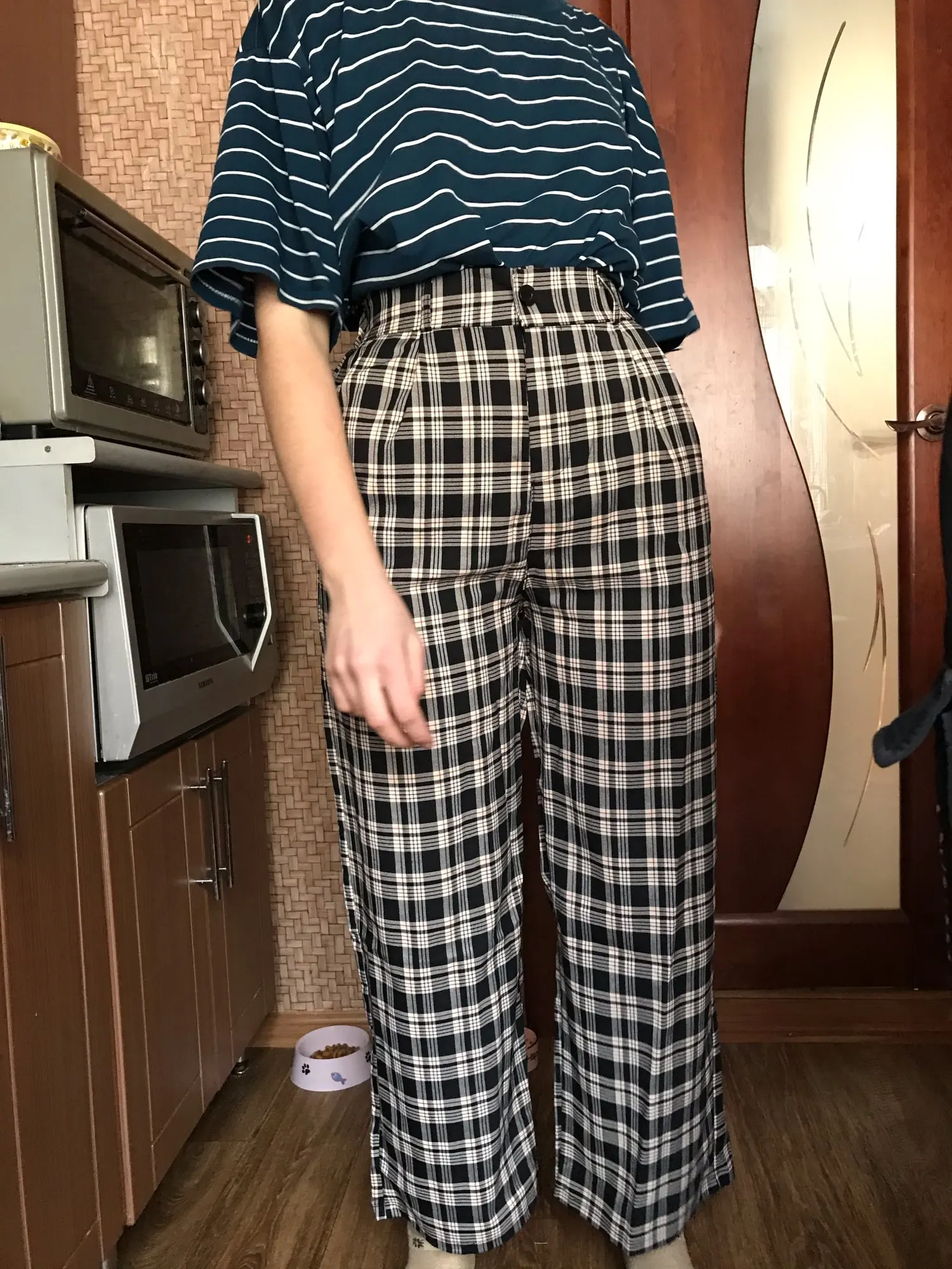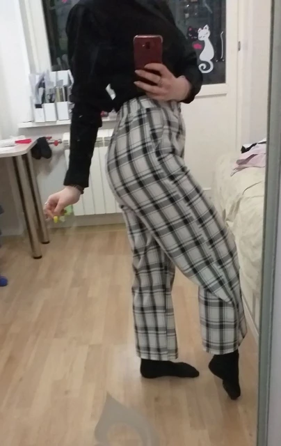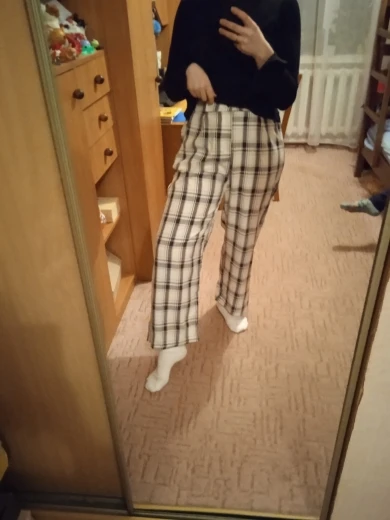 Штаны выглядят точно так же, как на картинке, материал приятный на ощупь, и мне очень нравится стиль штанов. Однако я белая девочка с абсолютно нормальным весом, отличная фигура, и я должен сказать, что из-за выреза штанов я выгляжу странным (как будто меньше, и это совсем не льстит мне) может быть, потому что он был сделан не для моего телосложения? Но сам продукт очень хороший :)