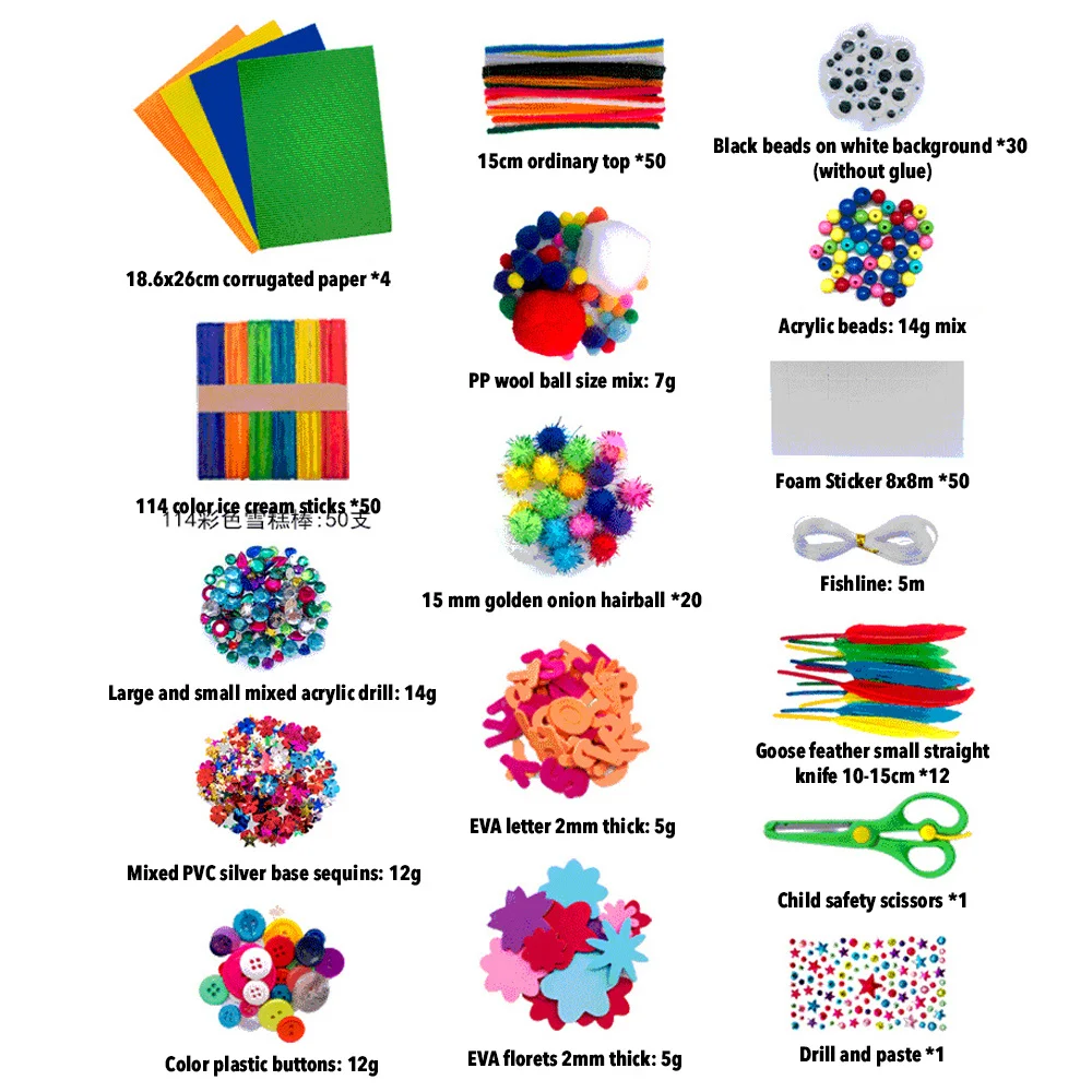 1. Большое цельное сочетание включает в себя: цветные очистители труб, помпоны, интересные блестки, глаза в форме глаз, буквы из пенопласта, цветы, Пластиковые Бусины, деревянные палочки, бумажные свитки, клеевые палочки, пластиковые безопасные ножницы, акриловые яркие бриллианты, пластиковые единороги и т. Д.