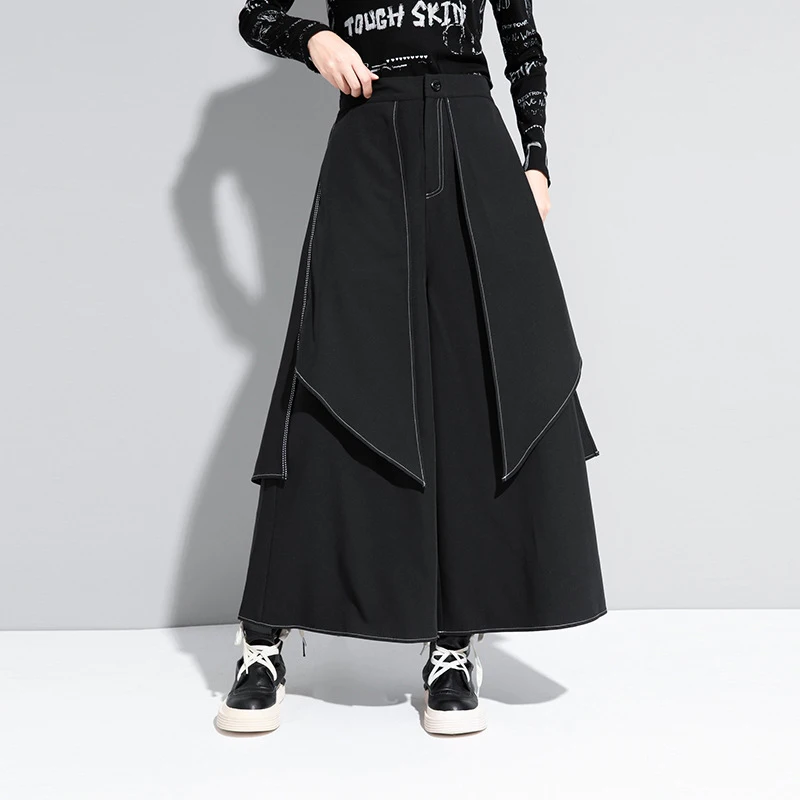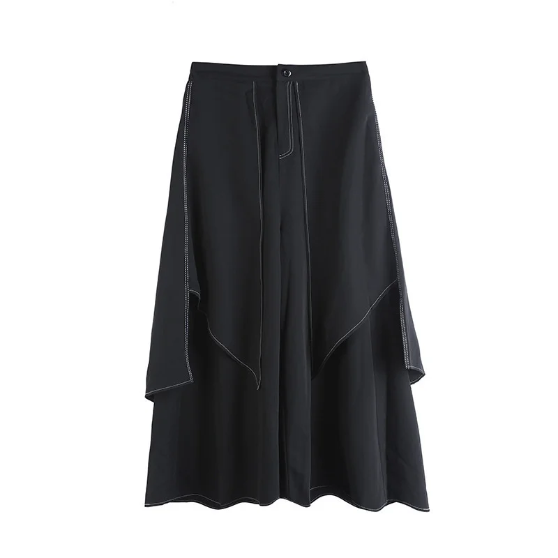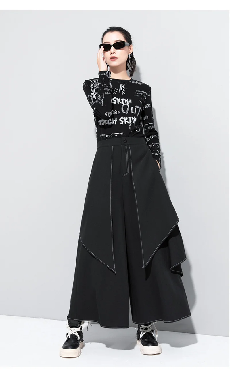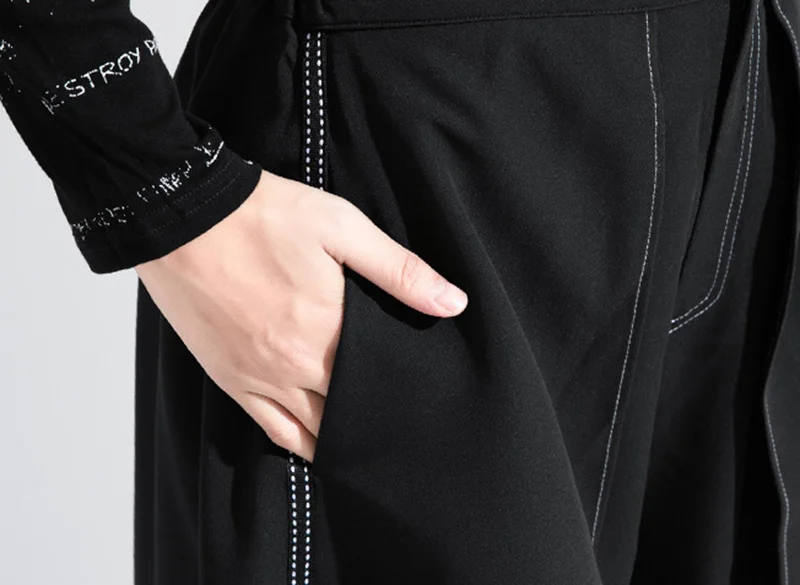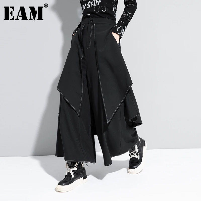 EAM Черные льняные брюки с высокой талией, с разрезом, длинные широкие брюки, новые свободные брюки, женские модные брюки, весна-осень 2022, 1DA613