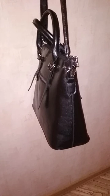 Сумка красивая, удобная. 3 отделения - 2 магнитные, а среднее на молнии. Внутри 2 кармана - один из них на молнии. 2 ручки - короткая ( полностью кожа), длинная (с одной стороны кожа, с другой ткань)