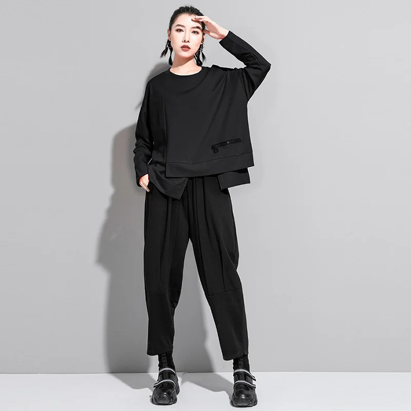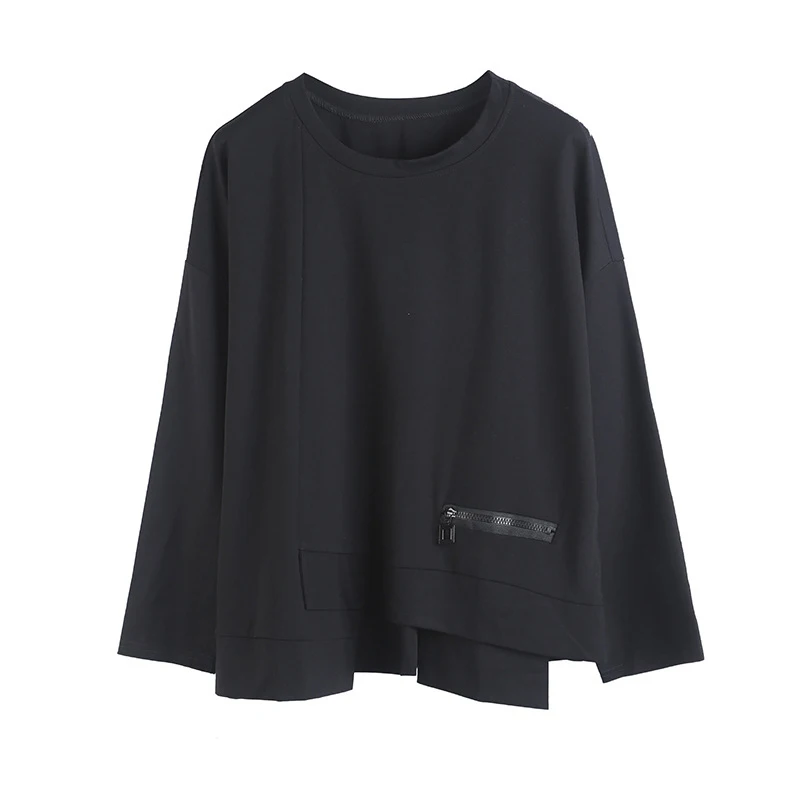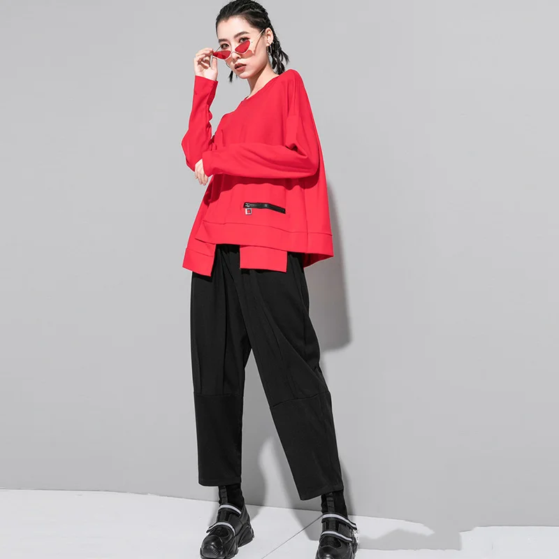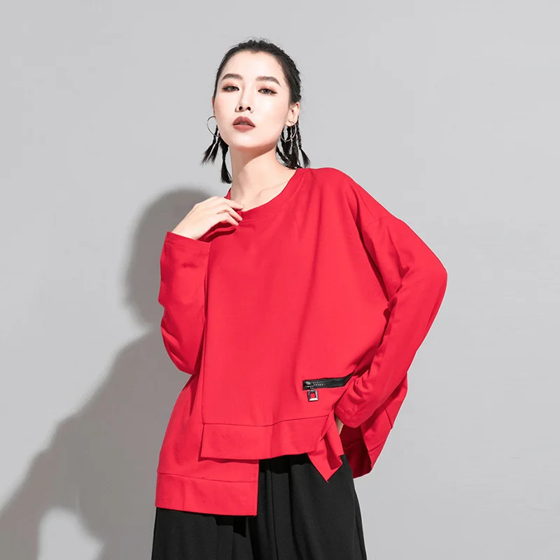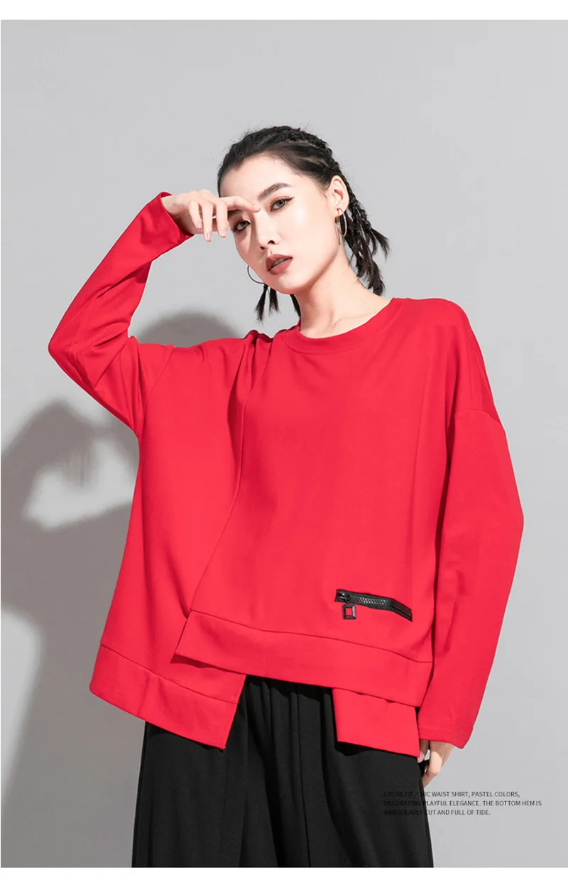 EAM Женская Красная Асимметричная футболка большого размера, новая модная футболка с круглым вырезом и длинными рукавами, весна-осень 2022 1DA605