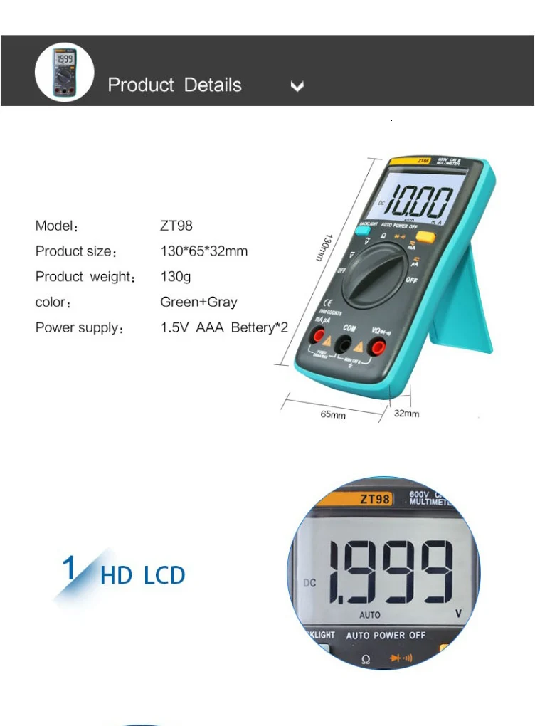 Цифровой мультиметр ZT98, 1999 отсчетов, подсветка, ЖК-дисплей, портативный вольтметр, амперметр, автоматический измеритель