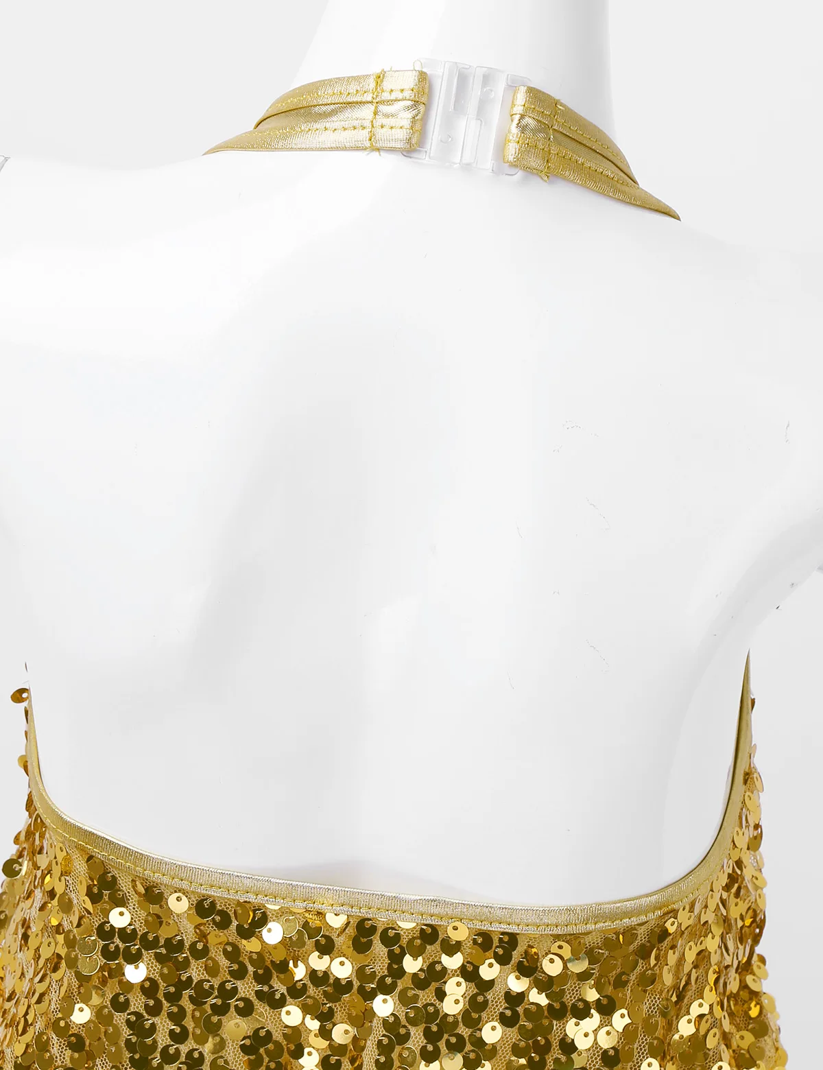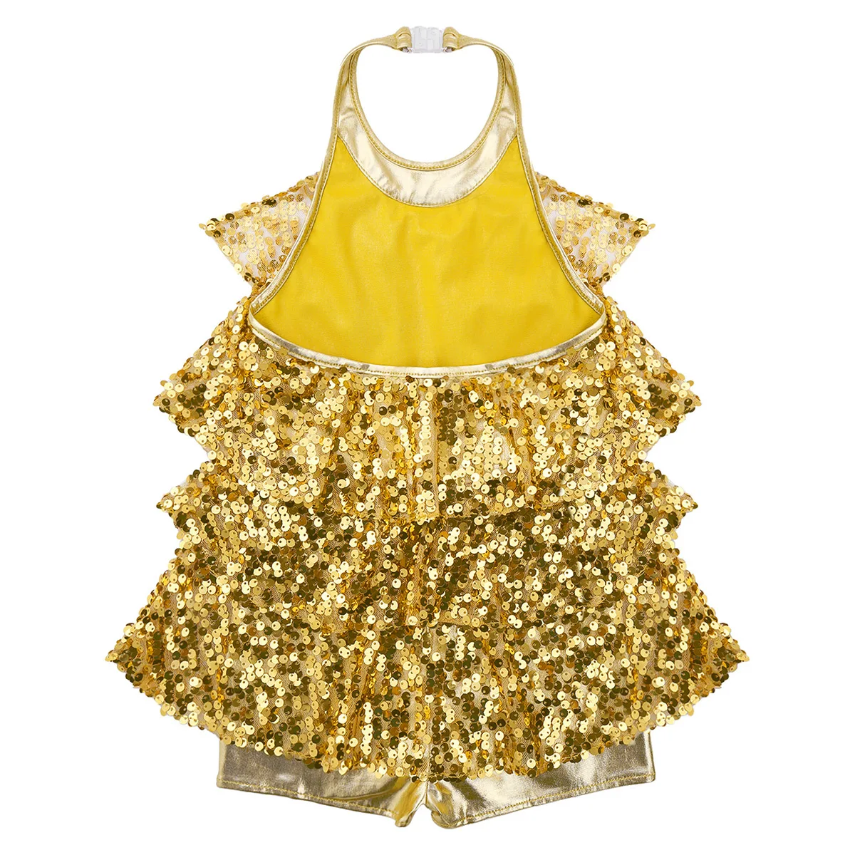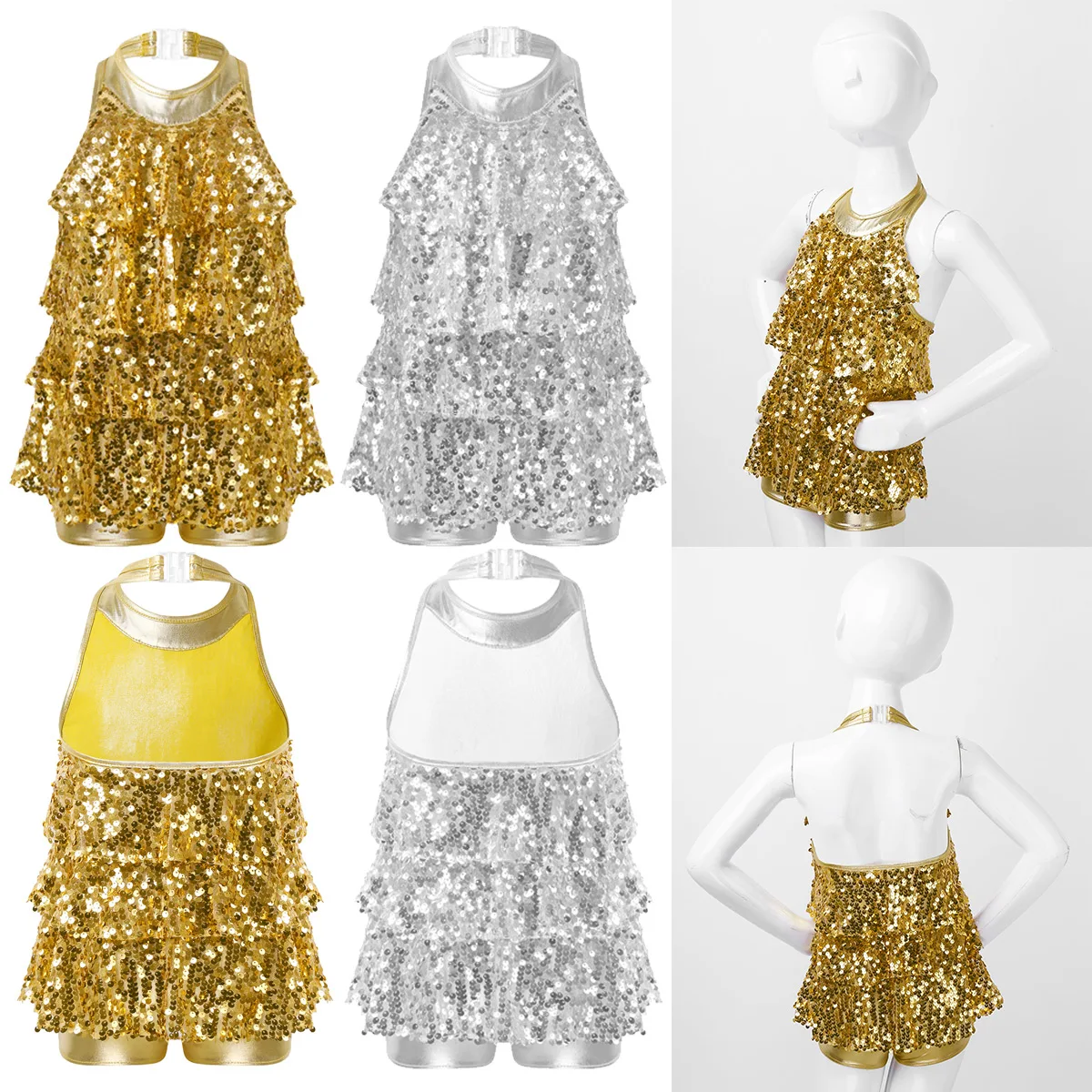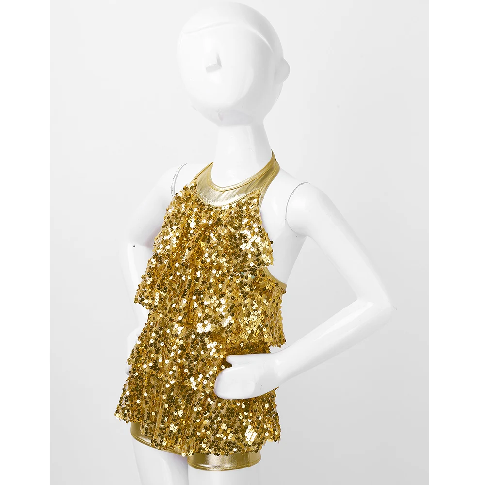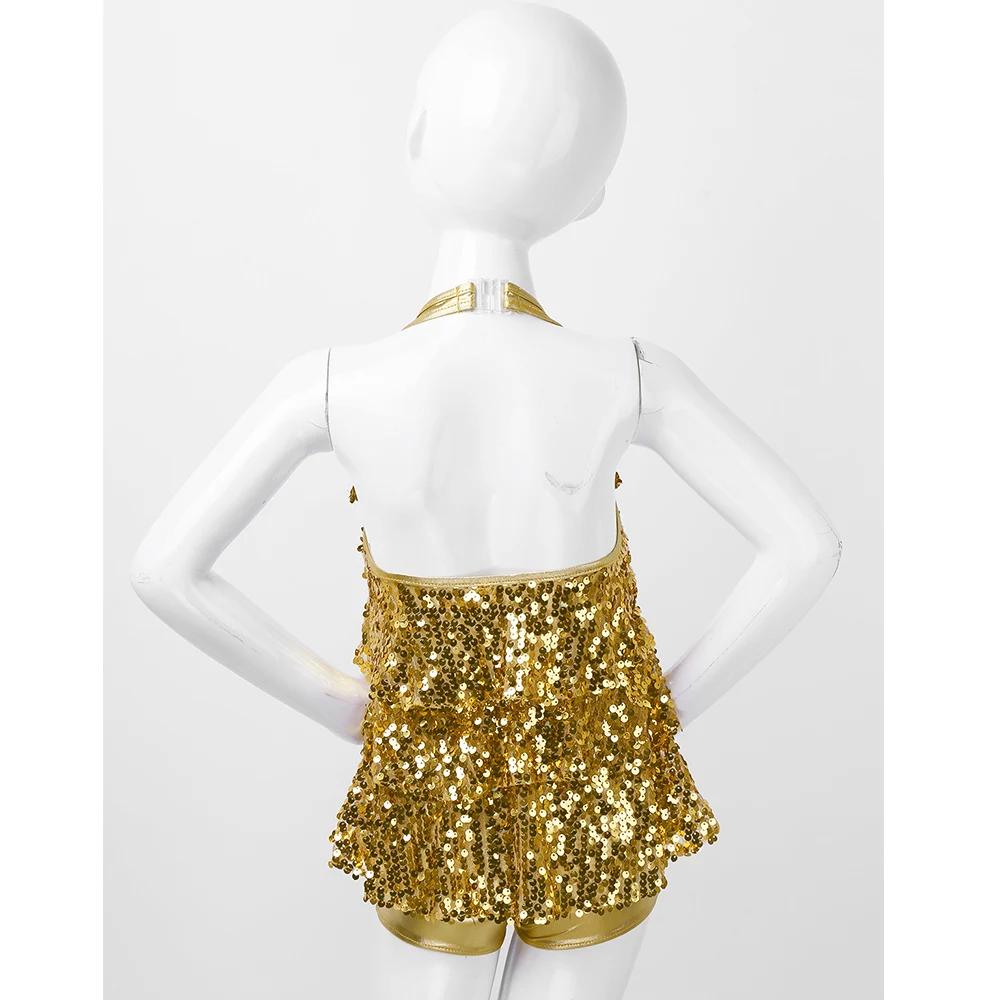 Детское платье с блестками и лямкой на шее для девочек, балетные костюмы с блестками и шортами, Современный Джаз, костюмы для латинских танцев, одежда в стиле рейв с блестками