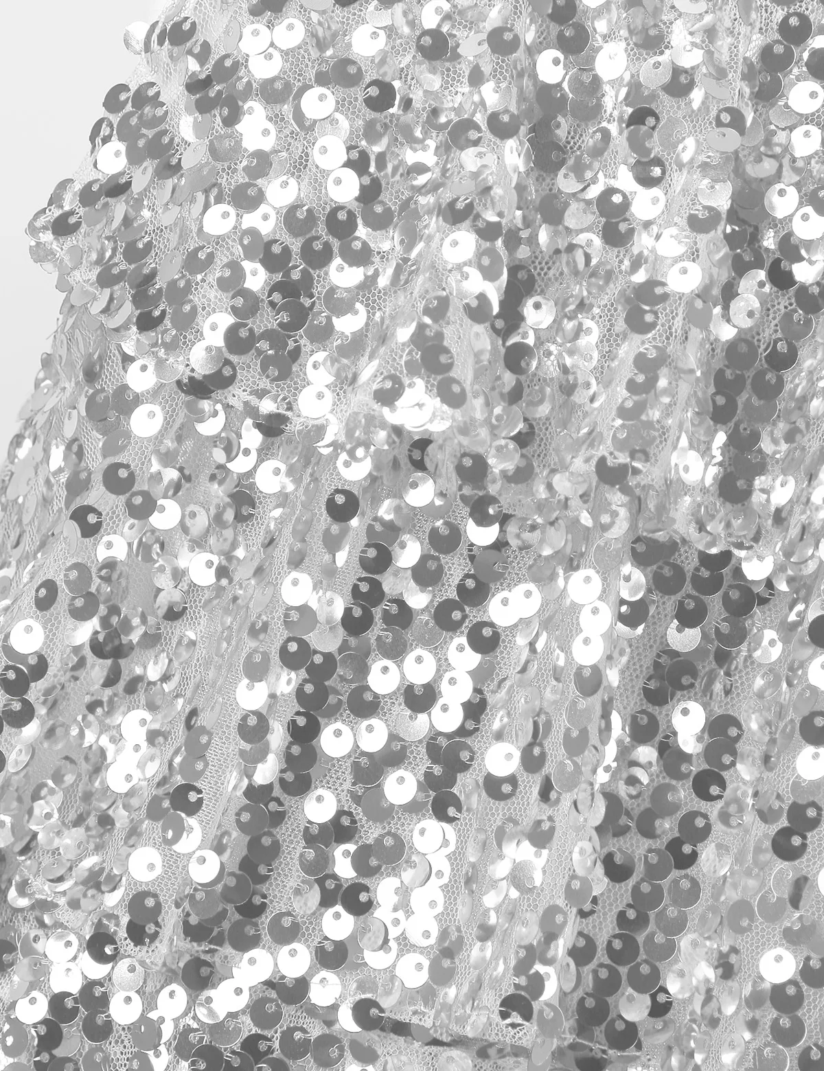 Вырез на шее с застежкой. Открытая верхняя часть спины. Короткое платье, украшенное многослойной сеткой с блестками.