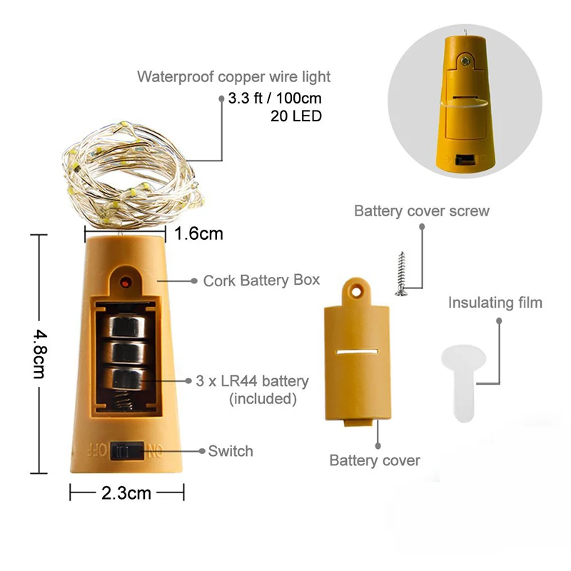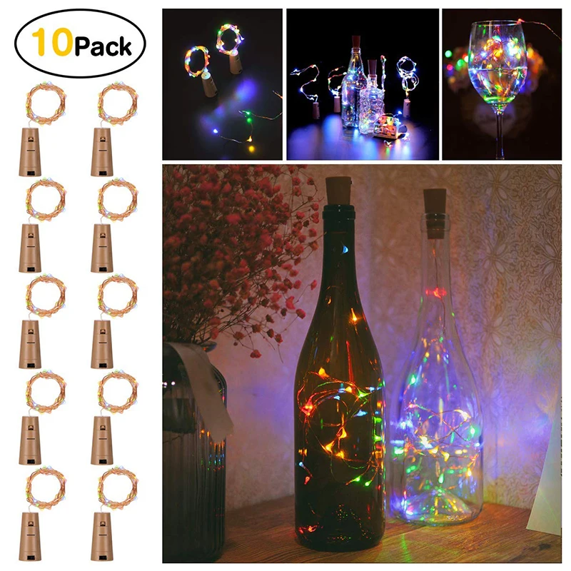 Светильники в форме винных бутылок с пробковой батареей СИД в форме пробки Серебряная медная проволока Фея мини гирлянда для DIY вечерние украшения Рождество Хэллоуин свадебное украшение освещениеПараметрыМатериал: медная нить и пластикЦвет излучения: теплый белый, белый, насыщенный цветПитание: 3 * AG13 кнопочный аккумулятор (в комплекте)Тип лампы: светодиодныйМощность: 0,5 ВтДлина шнура: 2 мОбщий светодиодный светильник для каждой линии: 20 светодиодный s ОсобенностиСтрунные лампы с 10 Супер яркими светодиодными лампами, низкий уровень тепла и экологически чистый дизайн, Милая Красивая бутылочная нить с пробкой, может создать романтическую, спокойную и теплую атмосферу после украшения.Наслаждайтесь DIY весельем и для многих случаев: изготовлен из высококачественной ультра тонкой медной проволоки, и эти светильники в форме винных бутылок с питанием от аккумулятора могут быть легко разработаны для любой формы DIY, которая вам нравится. Подходящие вечерние, свадебные, барбекю, Хэллоуин, Рождество, площадь, сад, для внутреннего и наружного декора и т. д. это также хороший подарок для ваших детей, друзей и семьи.Простота в использовании и установке: каждая пробка с переключателем ВКЛ/ВЫКЛ. Легко включается и выключается. Наши лампы для бутылок легко помещаются в верхнюю часть бутылки для вина. Вам не нужно просверливать отверстие в бутылке. Просто включите свет и наслаждайтесь этими потрясающими яркими сказочными огнями. Продукт включает в себя1 * светодиодные гирлянды (10 шт./лот)