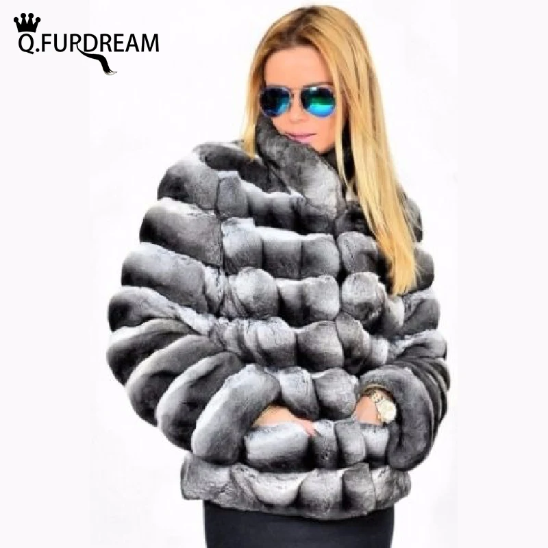 Q.FURDREAM модная короткая шуба из меха кролика Рекс, воротник-стойка, Шиншилла, высокое качество, зимняя теплая Роскошная теплая куртка