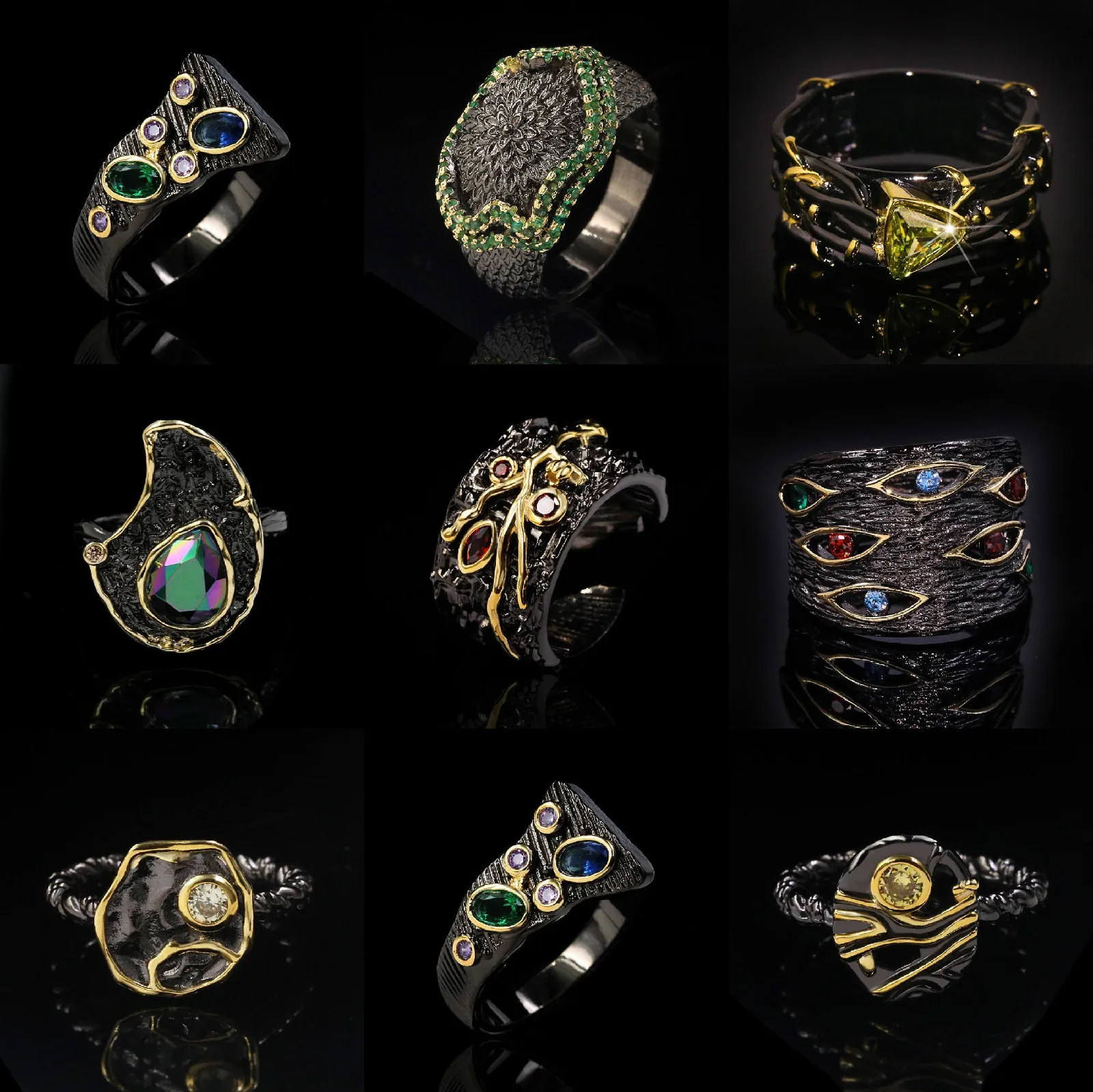 Итальянские ювелирные изделия из жемчуга для женщин в винтажном стиле с 925 Серебряные кольца два тона цвета: черный, золотистый, Фиолетовый кольцо с красным Цирконом Женская Свадебная вечеринка кольцо