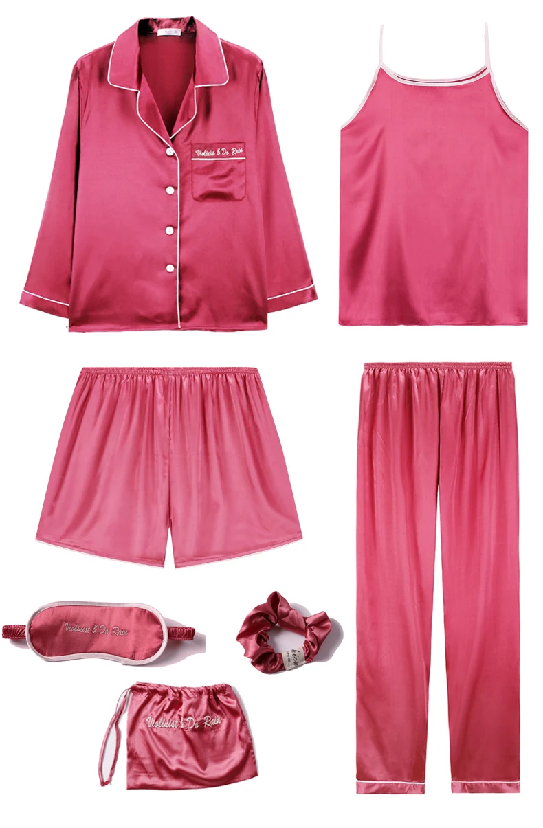 Пижамный комплект женский из 7 предметов, одежда для сна из искусственного шелка, красная пижама с длинным рукавом, на осеньвеснузиму
