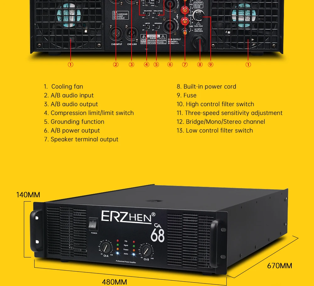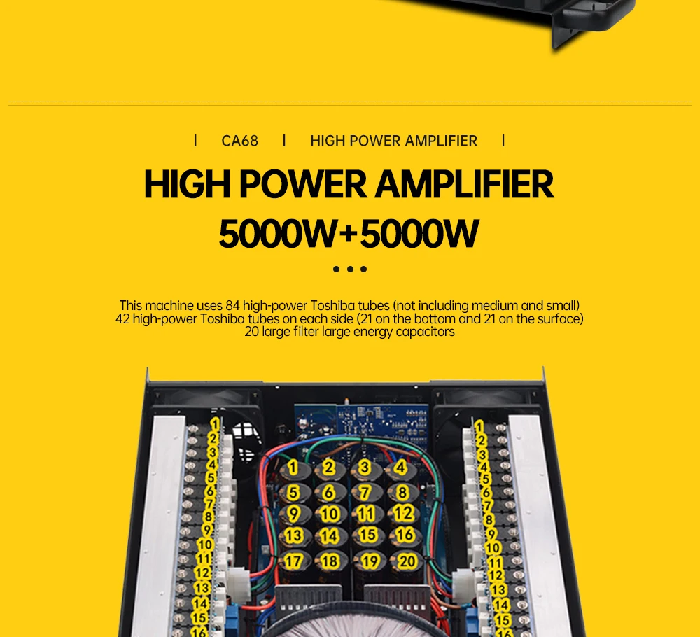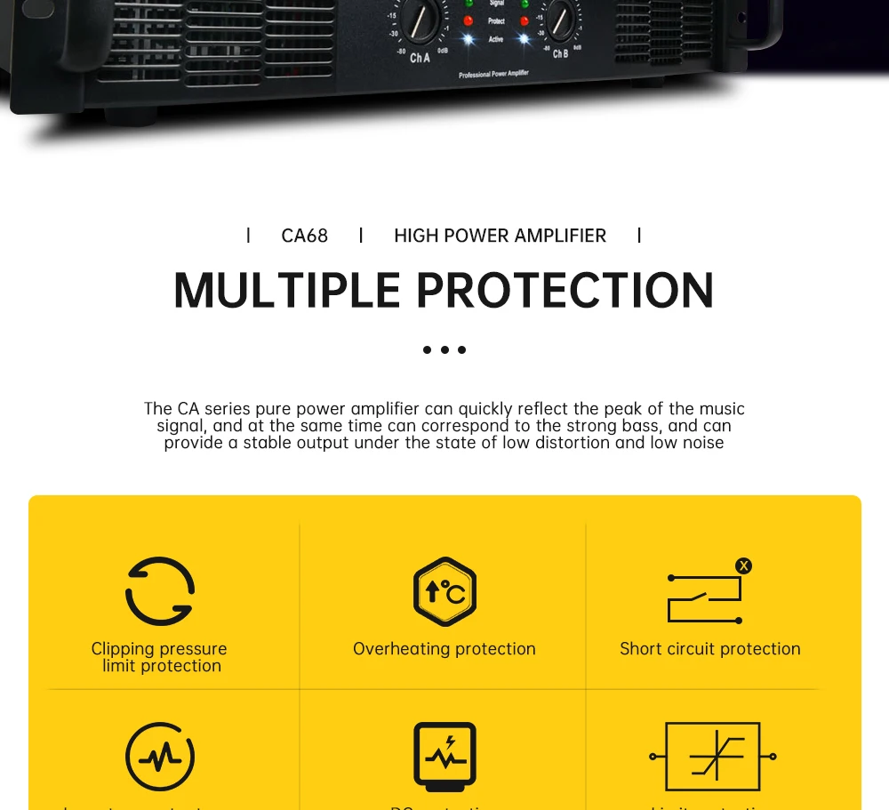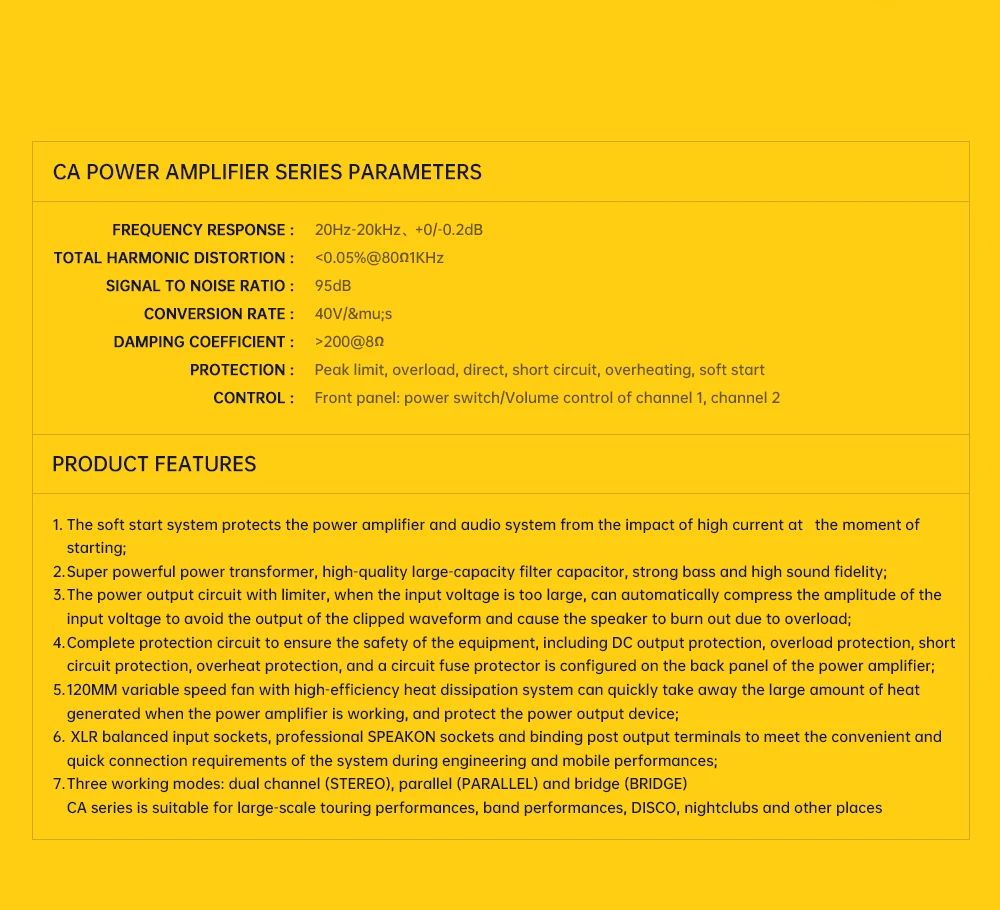 Введение профессионального усилителя мощности серии CA:CA20: 2800 Вт * 2CA38: 3800 Вт * 2CA68: 5000 Вт * 2Подходит для: 110 В, 220 ВСерия CA-это модель китайского кольцевого усилителя мощности коровы! Серия CA-это усилитель мощности, разработанный компанией Shengquan для обеспечения высокого стандарта аудио производительности. В настоящее время оно разработано до шестого поколения. Различные функции защиты были значительно усовершенствованы на очень зрелых и стабильных линиях серии CA старого поколения. В том числе плавный пуск, электронный переключатель и т. д. в то же время, дизайн цепи и процесс производства оптимизированы. Он принимает масштабную сборочную линию производства, и готовая продукция была протестирована через 8 процедур контроля качества, И динамика обработки стареет в течение длительного времени, чтобы обеспечить консистенцию и стабильность продукта в максимальной степени. Новые мощные CA20 CA38 CA68 принимает новое поколение 3-х уровневый h-образная стальная стабильный линии 3-х уровневый h-образная стальная устойчивой линии, В то время как оптимизации h-образная стальная пуш-ап модуль. Стабильность всей машины еще больше улучшается.Усилители мощности серии CA отрываются от линейки EX, MA и L серий и являются серией, разработанной на другой платформе. Продукция серии CA покрывает высоту 2U-3U и диапазон мощности 250 Вт-1600 Вт (двойной звуковой канал 8 Ом). Серия CA обеспечивает более быструю скорость отклика, более высокий коэффициент демпфирования, более широкие функции и более продвинутую систему защиты. Серия CA отличается превосходным дизайном охлаждающего воздуховода, компактной и стабильной механической ударопрочностью, технологией производства SMT и сложными компонентами. Усилители мощности серии CA могут выдерживать стерео 2Ω, мостовую нагрузку 4Ω, подходящую для вождения линейных массивов акустических систем.Серии CA подходят для масштабных туринговых представлений, ленточных выступлений, дискотек, ночных клубов и других случаев.
