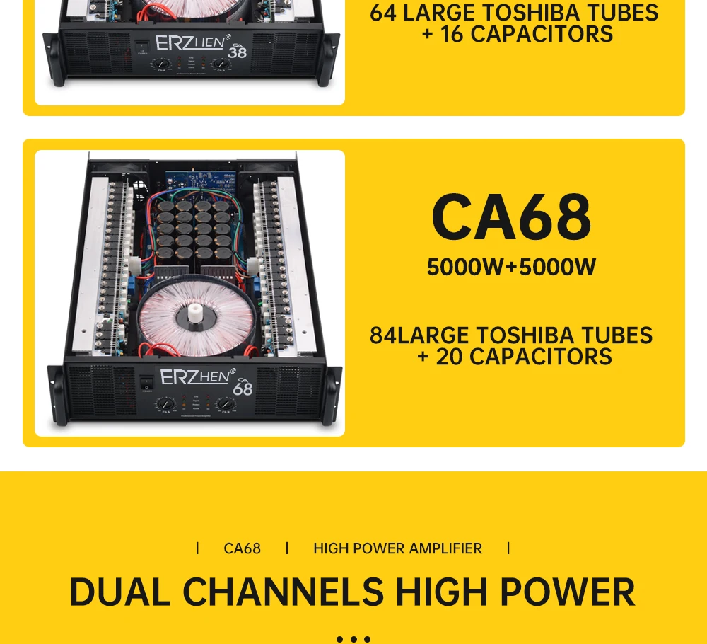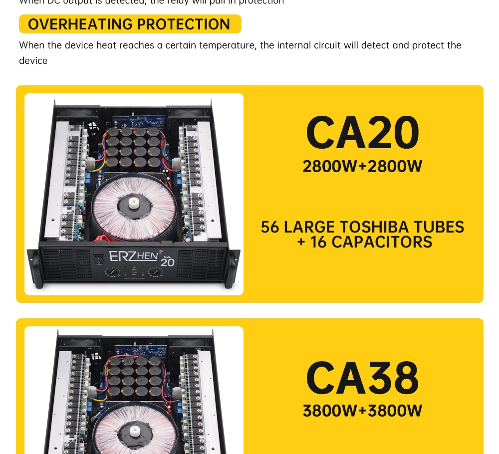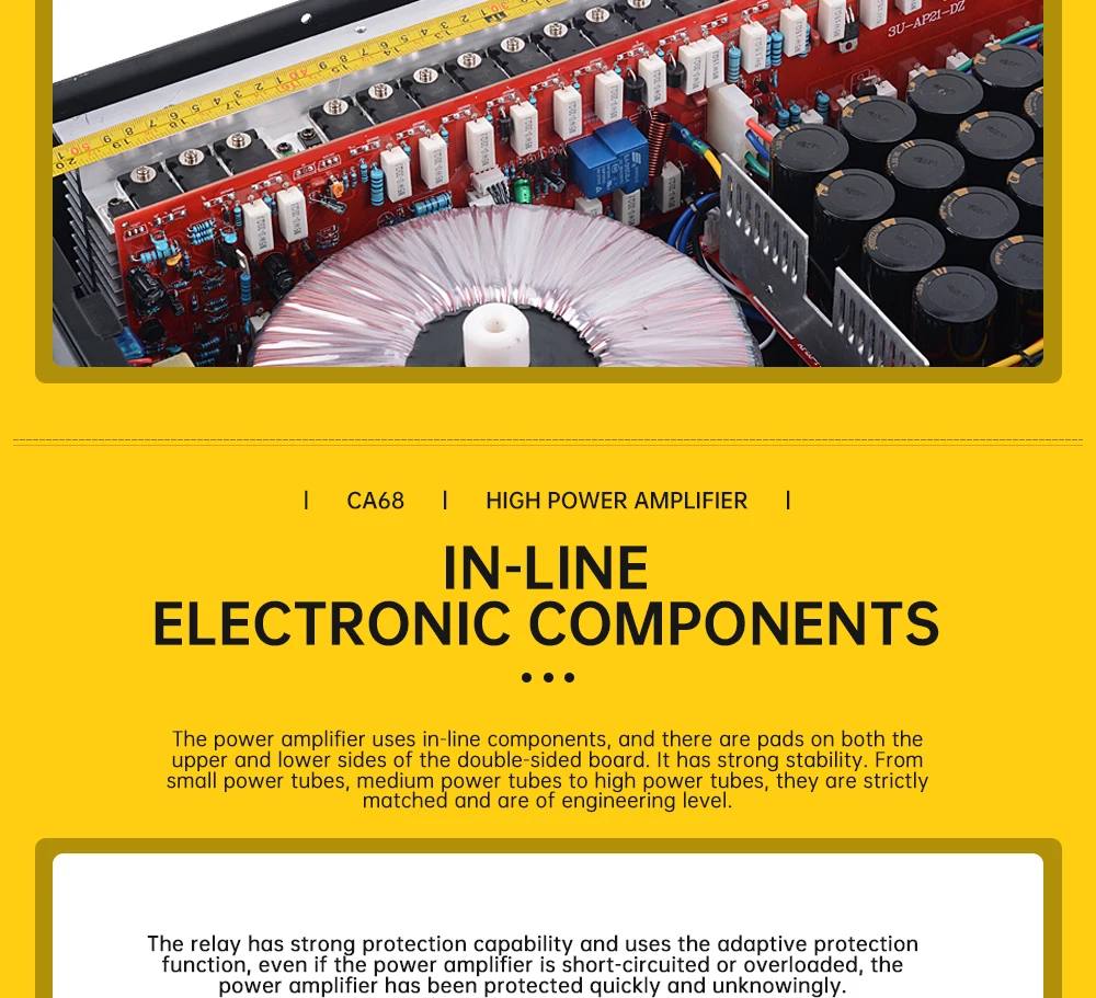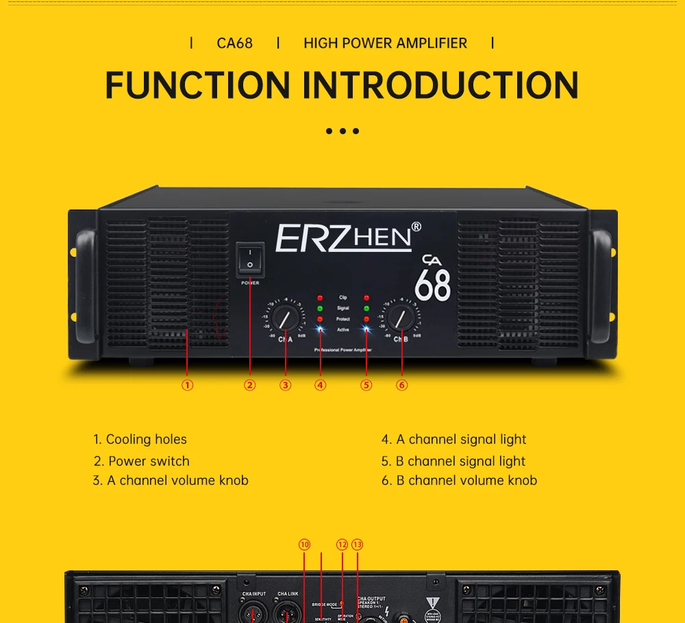 Введение профессионального усилителя мощности серии CA:CA20: 2800 Вт * 2CA38: 3800 Вт * 2CA68: 5000 Вт * 2Подходит для: 110 В, 220 ВСерия CA-это модель китайского кольцевого усилителя мощности коровы! Серия CA-это усилитель мощности, разработанный компанией Shengquan для обеспечения высокого стандарта аудио производительности. В настоящее время оно разработано до шестого поколения. Различные функции защиты были значительно усовершенствованы на очень зрелых и стабильных линиях серии CA старого поколения. В том числе плавный пуск, электронный переключатель и т. д. в то же время, дизайн цепи и процесс производства оптимизированы. Он принимает масштабную сборочную линию производства, и готовая продукция была протестирована через 8 процедур контроля качества, И динамика обработки стареет в течение длительного времени, чтобы обеспечить консистенцию и стабильность продукта в максимальной степени. Новые мощные CA20 CA38 CA68 принимает новое поколение 3-х уровневый h-образная стальная стабильный линии 3-х уровневый h-образная стальная устойчивой линии, В то время как оптимизации h-образная стальная пуш-ап модуль. Стабильность всей машины еще больше улучшается.Усилители мощности серии CA отрываются от линейки EX, MA и L серий и являются серией, разработанной на другой платформе. Продукция серии CA покрывает высоту 2U-3U и диапазон мощности 250 Вт-1600 Вт (двойной звуковой канал 8 Ом). Серия CA обеспечивает более быструю скорость отклика, более высокий коэффициент демпфирования, более широкие функции и более продвинутую систему защиты. Серия CA отличается превосходным дизайном охлаждающего воздуховода, компактной и стабильной механической ударопрочностью, технологией производства SMT и сложными компонентами. Усилители мощности серии CA могут выдерживать стерео 2Ω, мостовую нагрузку 4Ω, подходящую для вождения линейных массивов акустических систем.Серии CA подходят для масштабных туринговых представлений, ленточных выступлений, дискотек, ночных клубов и других случаев.