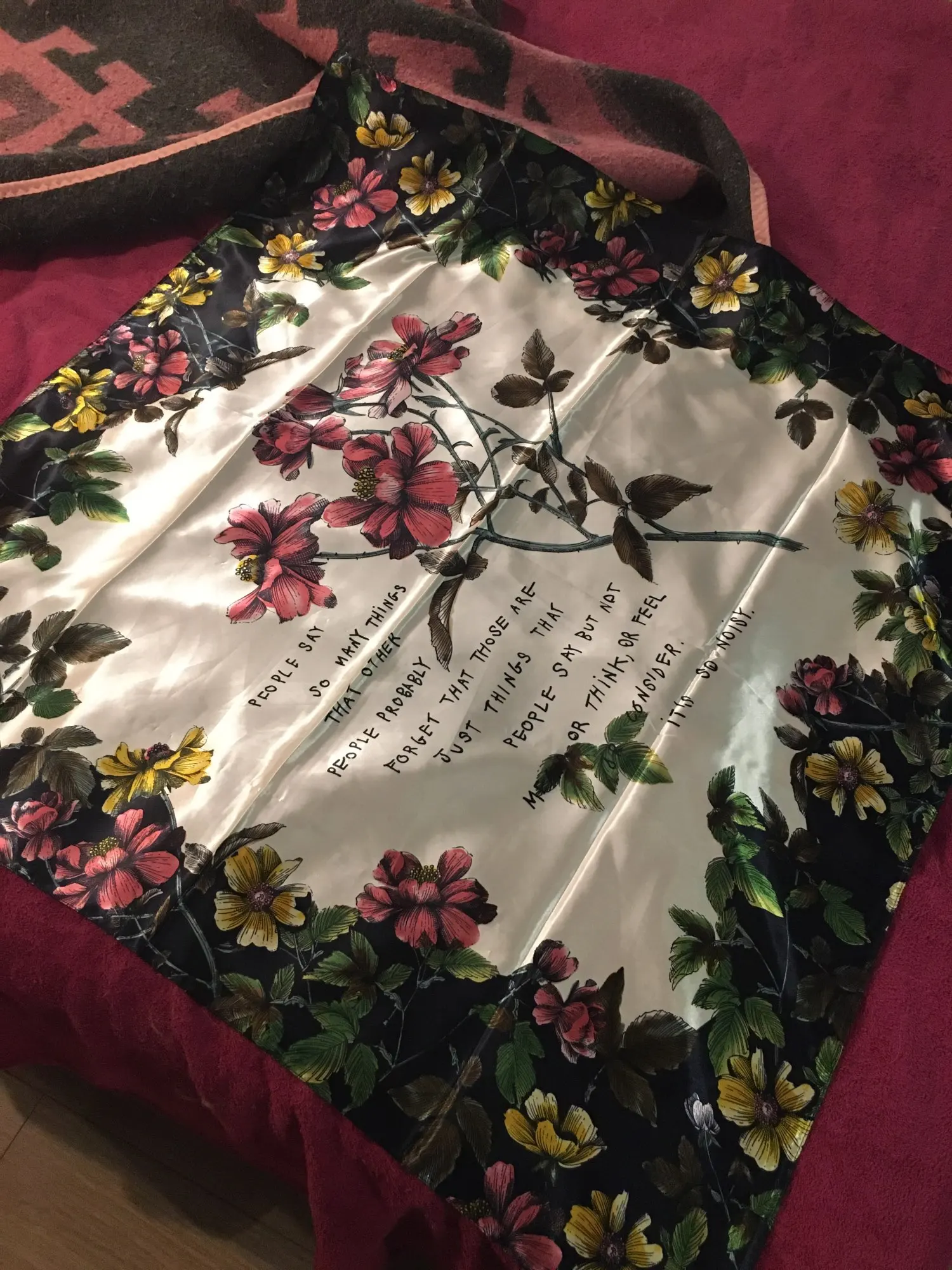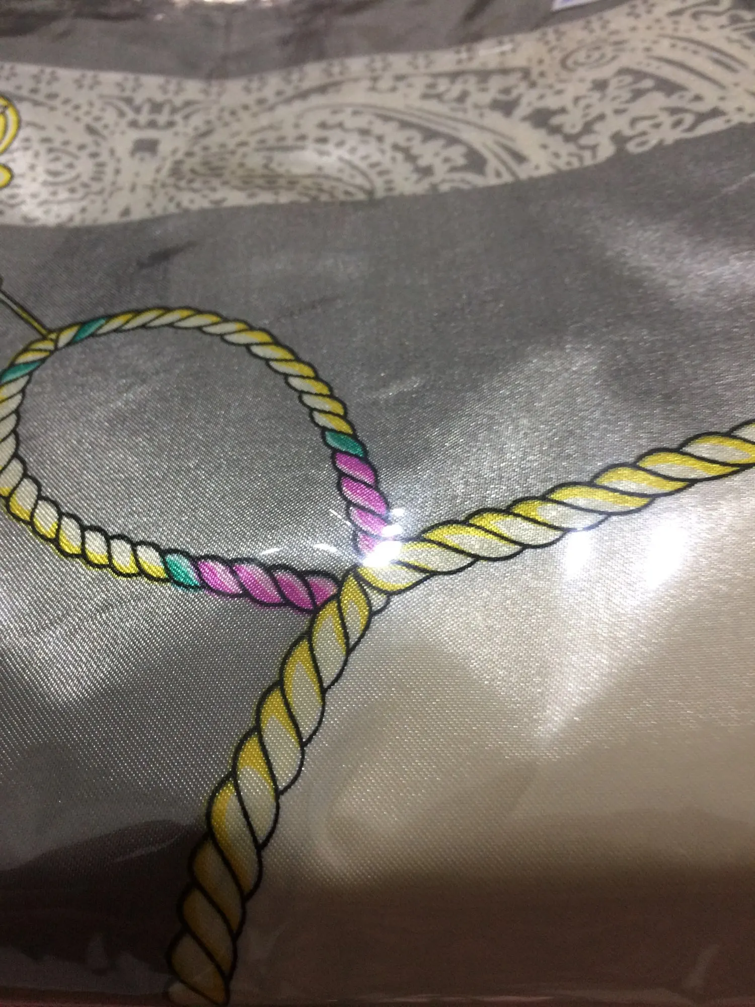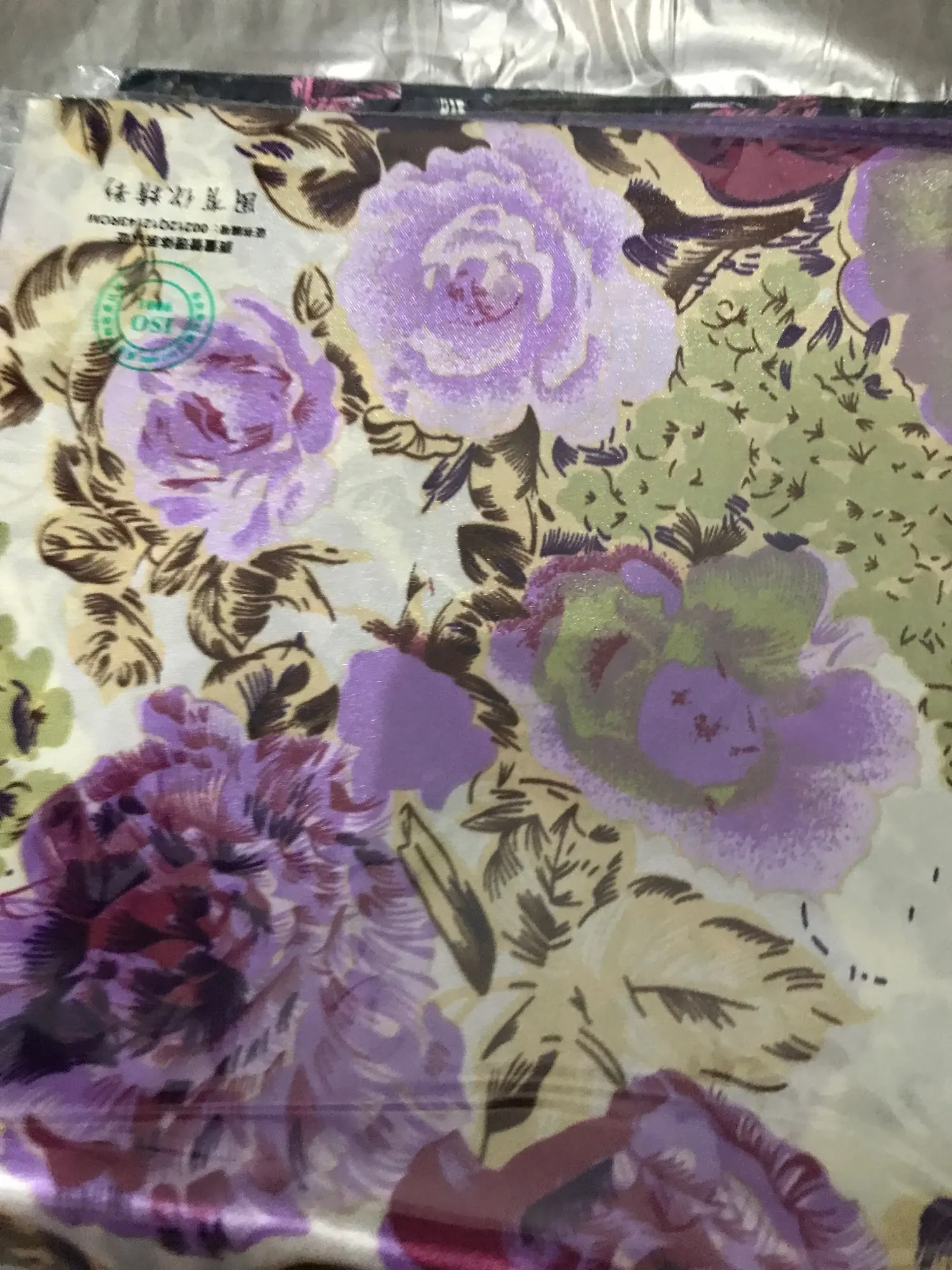 Материал сделан из «шелковистого полиэстера». Ткань блестит и мягкая, как шелк. Очень хорошее соотношение цены и качества. Рисунок хорошо нарисован, а цвета красивые и яркие. Эти шарфы могут сделать очень красивые furoshiki. Спасибо продавцу, который я рекомендую.