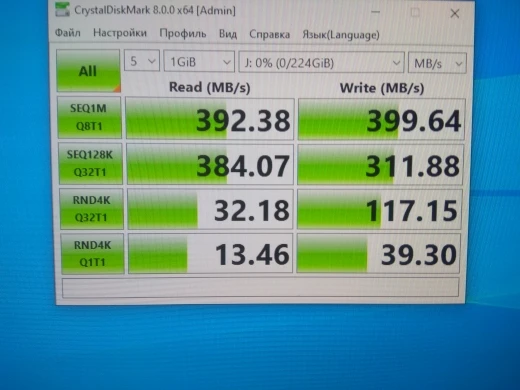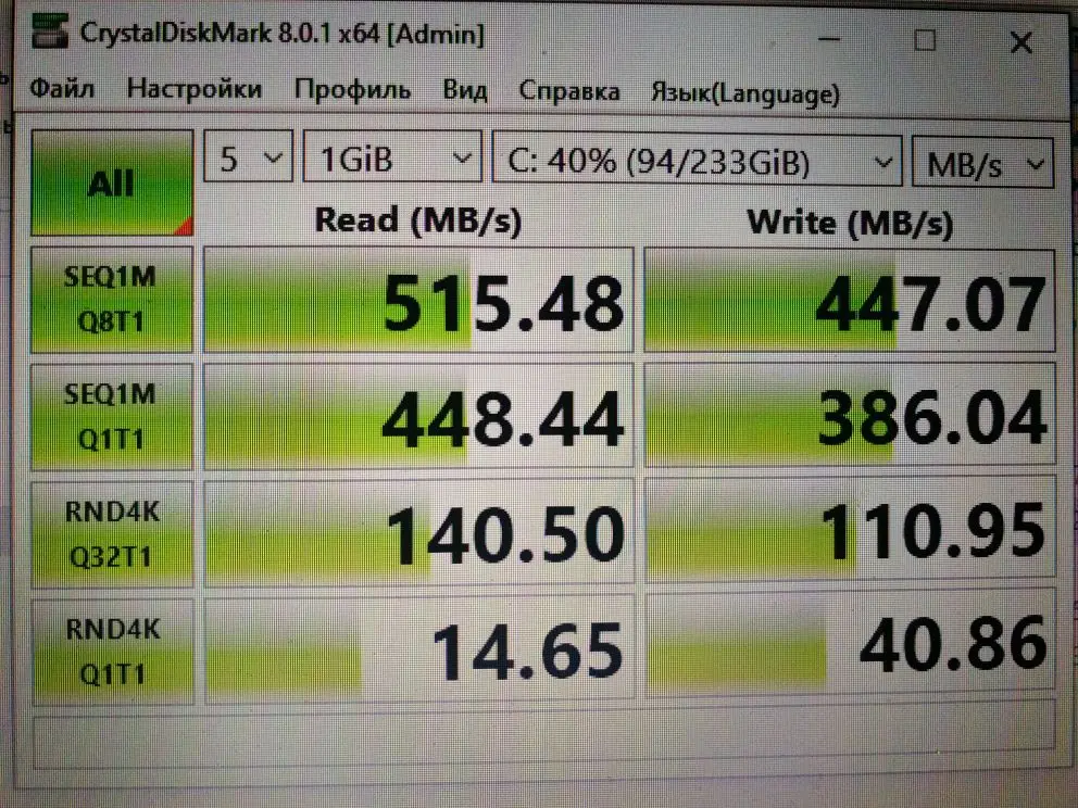 нормальный диск. Доступно около 478Гб. Скорость чтения в районе 520Мб Скорость записи около 280Мб(при копировании с другого ССД)