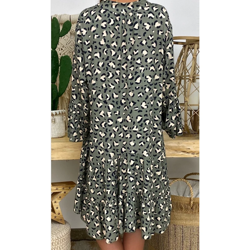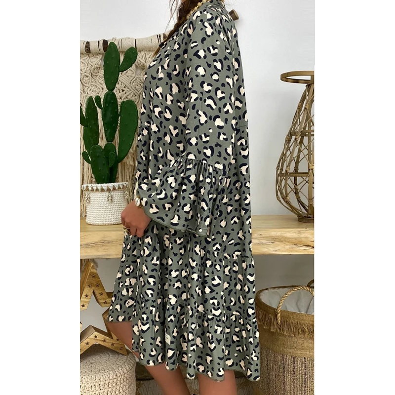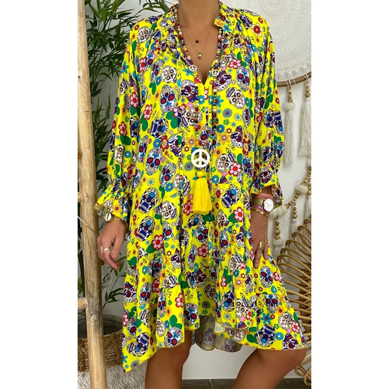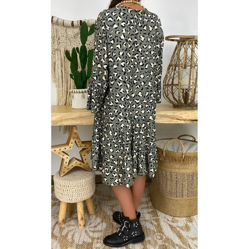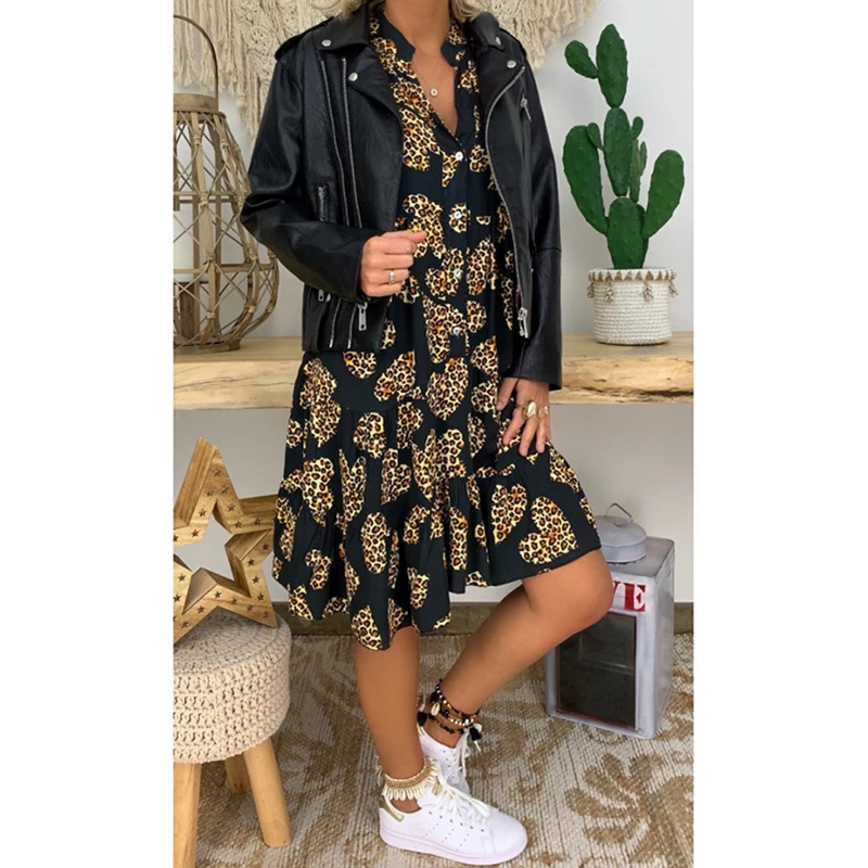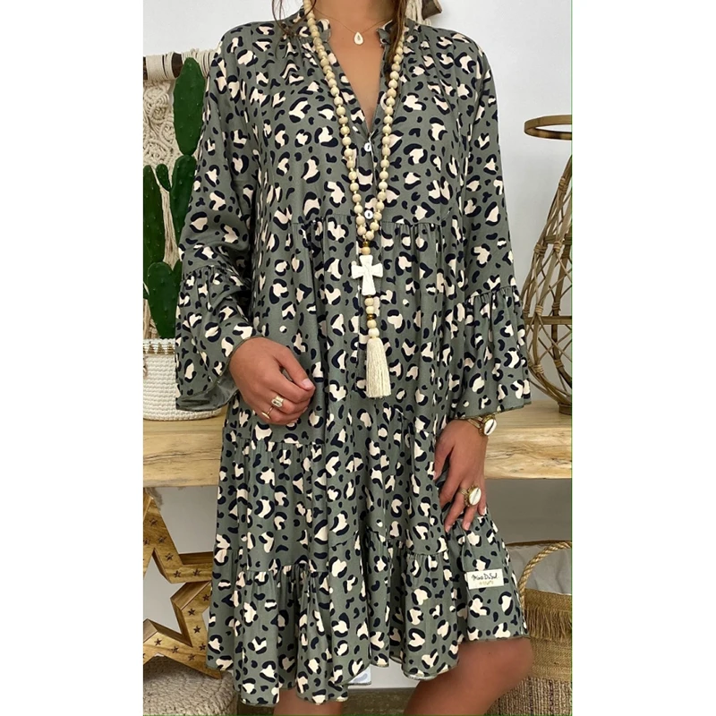 Осенние модные новые платья с V-образным вырезом и принтом, повседневные платья на пуговицах, свободные платья средней длины, элегантная уличная одежда, женские платья для вечеринок