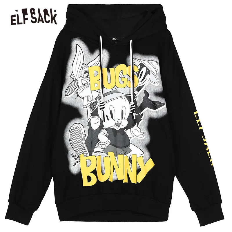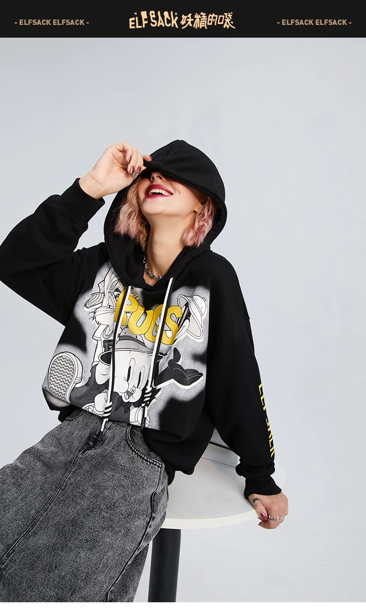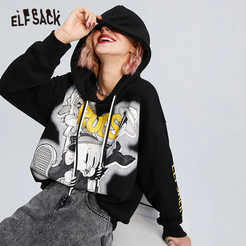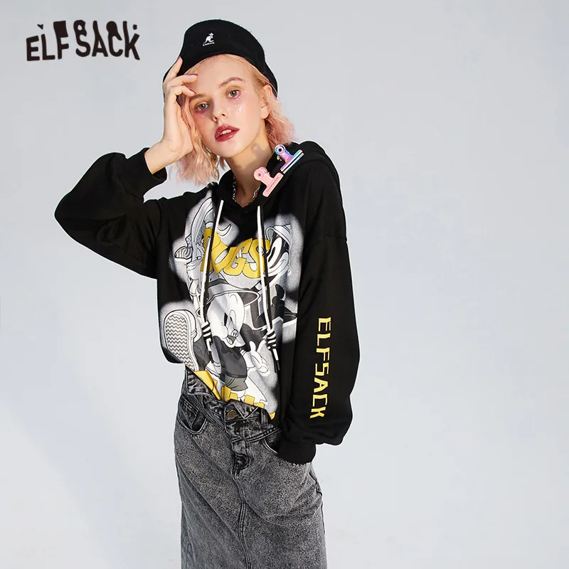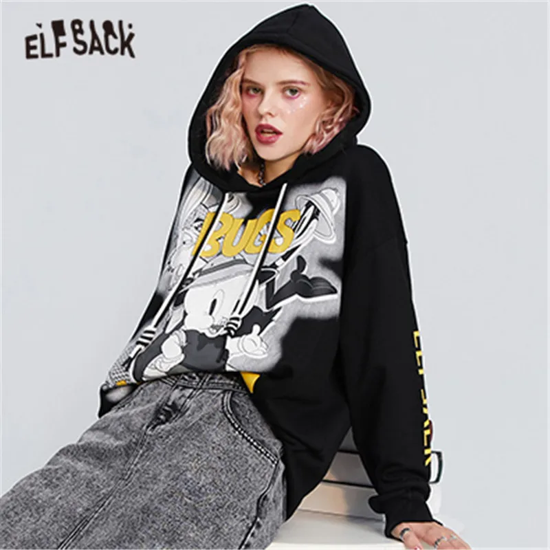 ELFSACK Harajukuчерная Повседневная Толстовка с капюшоном большого размера с мультяшным принтом для женщин, осенняя Женская толстовка в Корейском стиле эльфа 2020, повседневный милый топ