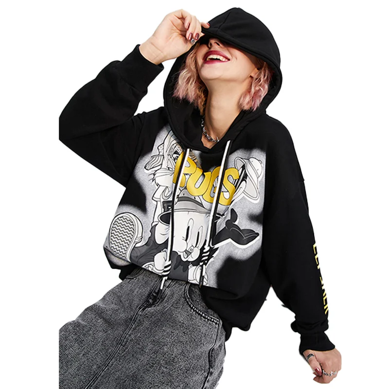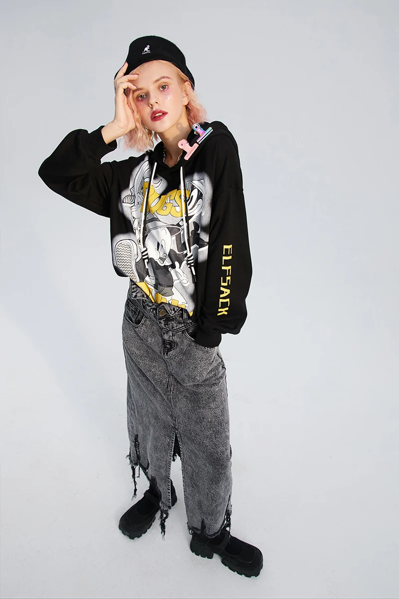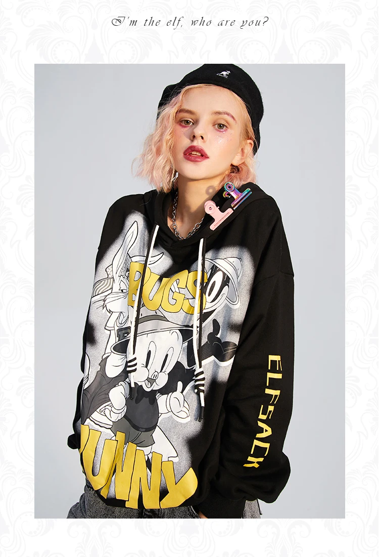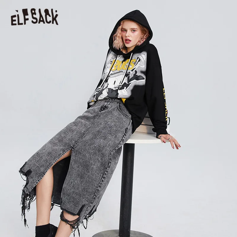 ELFSACK Harajukuчерная Повседневная Толстовка с капюшоном большого размера с мультяшным принтом для женщин, осенняя Женская толстовка в Корейском стиле эльфа 2020, повседневный милый топ