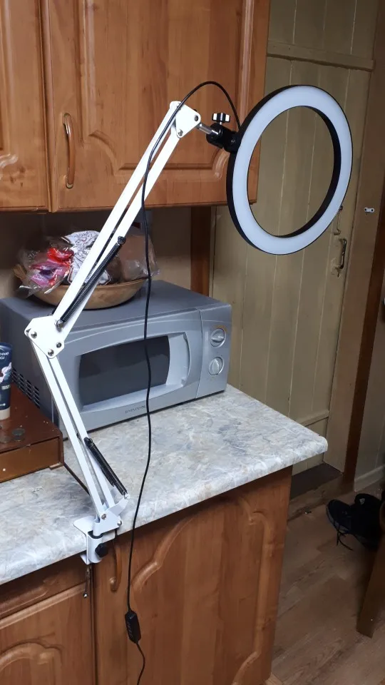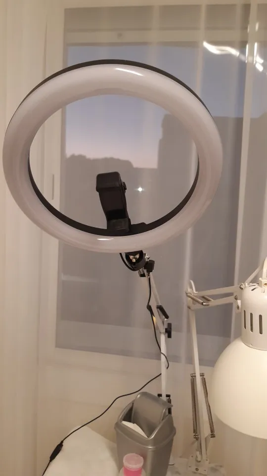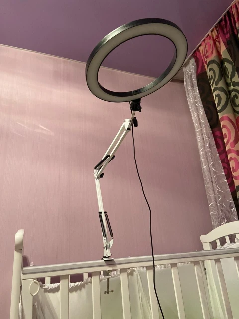 доставка до Смоленска месяц, но ожидания того стояли. коробка конечно помялась очень, но товар не пострадал, всё работает. свет яркий, для фото маникюра отлично. три варианта освещения теплый, дневной, холодный. в комплекте нет вилки, но это не проблема, подключить можно к любому от телефона адаптеру. крепления надежные, телефон Хонор держит, не падает, только туго надо винты подтягивать. Провод длинный достаточно.