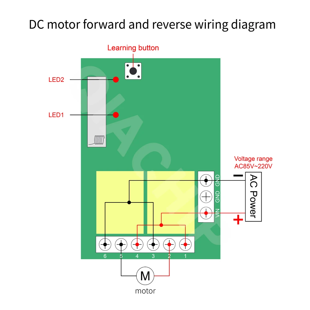 Очистка кода:Нажмите кнопку обучения на приемниках 8 раз, коды будут очищены.После очистки кода все пульты управления больше не будут работать.Изучение кода: (мгновенное)Нажмите кнопку обучения на приемнике 1 раз, он переходит в режим мгновенной настройки.Подождите немного светодиодный погаснет, он переходит в режим обучения.Нажмите кнопку дистанционного управления «A», светодиодный индикатор на плате приемника начнет мигать, а затем погаснет. Дистанционная кнопка «A» будет управлять реле сигнала.Затем нажмите кнопку дистанционного управления «B», светодиодный индикатор на плате приемника начнет мигать, затем погаснет. Удаленная кнопка «B» будет управлять вторым реле. Настройка выполнена.Изучение кода: (переключение)Нажмите кнопку обучения на приемнике 2 раза, он переходит в режим мгновенного переключения.Подождите немного светодиодный погаснет, он переходит в режим обучения.Нажмите кнопку «A» на пульте дистанционного управления, светодиодный индикатор на плате приемника начнет мигать, а затем погаснет. Дистанционная кнопка «A» будет управлять реле сигнала.Затем нажмите кнопку дистанционного управления «B», светодиодный индикатор на плате приемника мигнет, затем погаснет. Удаленная кнопка «B» будет управлять вторым реле. Настройка выполнена.Изучение кода: (блокировка)Нажмите кнопку обучения на приемнике 3 раза, он переходит в режим моментальной блокировки.Подождите немного светодиодный погаснет, он переходит в режим обучения.Нажмите кнопку «A» на пульте дистанционного управления, светодиодный индикатор на плате приемника начнет мигать, а затем погаснет. Дистанционная кнопка «A» будет управлять реле сигнала.Затем нажмите кнопку дистанционного управления «B», светодиодный индикатор на плате приемника начнет мигать, а затем погаснет. Дистанционная кнопка «B» будет управлять вторым реле. Настройка выполнена. Другие кнопки разблокировки отключены по умолчанию.