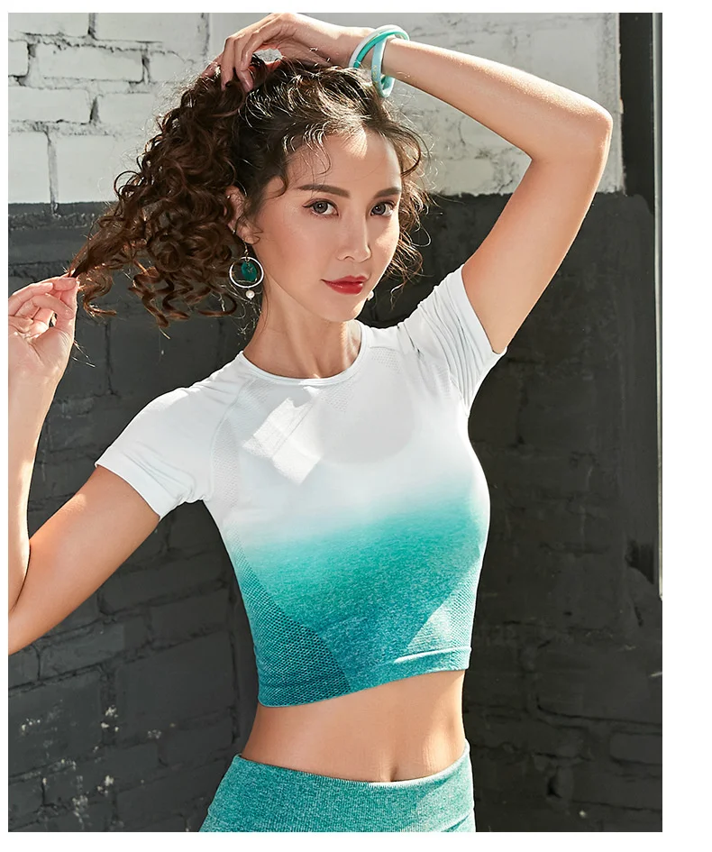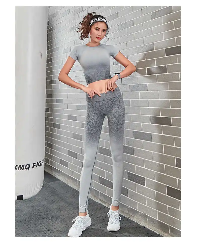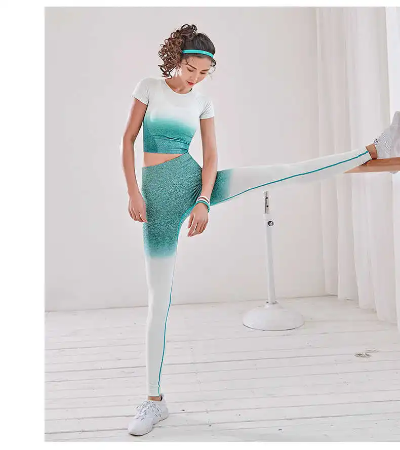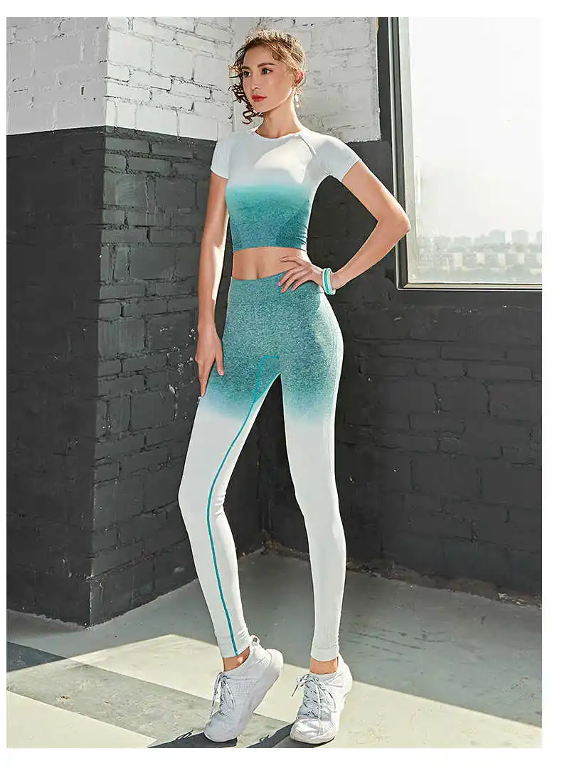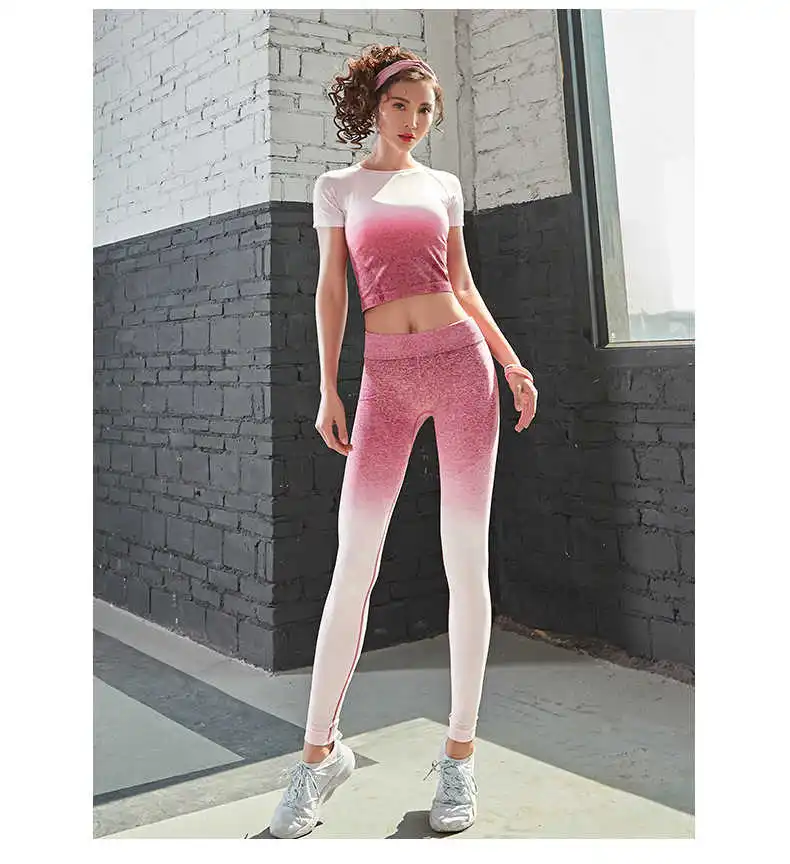 Женский комплект для йоги, бесшовный спортивный костюм, леггинсы с высокой талией, футболка с коротким рукавом, укороченный топ, костюм для фитнеса, тренировок