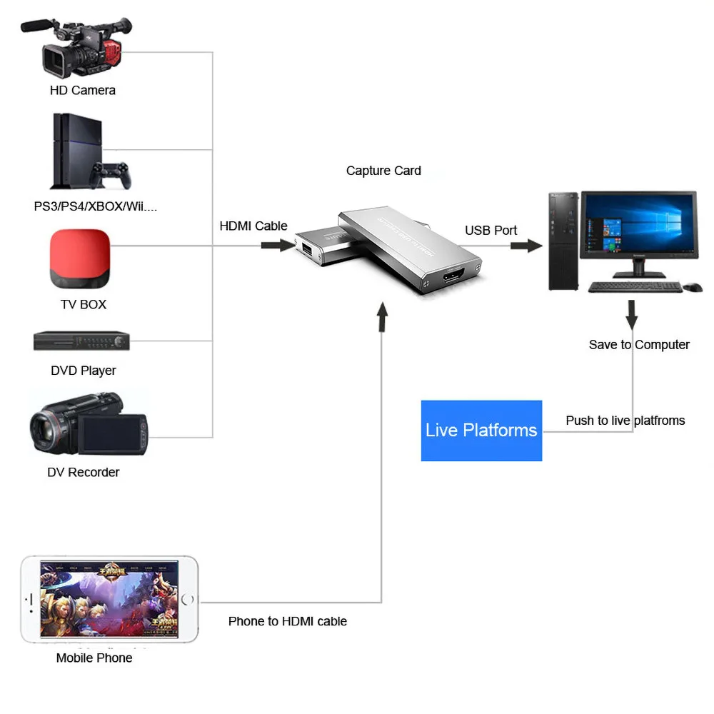 Устройство для захвата видео 4K, 1080P HD, прямая трансляция, USB 2,0, HDMI-Совместимо с ПК, PS4, XBOX One, рекордер потокового видео для игр