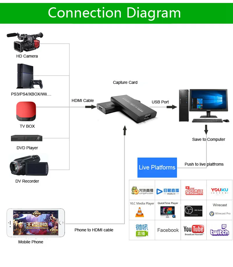 4K HDMI к USB2.0 видео захвата ключ, он легко носить с собой, имеют превосходную производительность, превосходную совместимость, простая установка и многие другие функции, он может захватывать один HDMI 1080p60 вход и выходной сигнал; совместимость с Windows,Linux,Macos X и USB интерфейсом, совместимость со многими чипсетами USB (Intel,Renesas,ASMedia,Fresco Logic), совместимость с USB и предварительный просмотр, запись, захват, Прямая трансляция через несколько бесплатных сторонних вечерние программы через интерфейс USB; Видеозахвата HDMI Соответствует стандарту UVC и UAC.