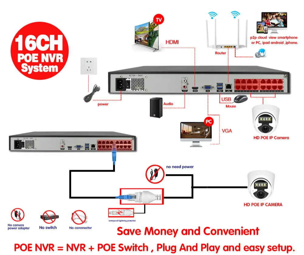 Нет дополнительных кабелей питания или адаптеров, просто подключив ip-камеру к NVR с помощью одного кабеля, вы можете легко завершить установку без знания о компьютере или сети и начать наслаждаться супер простым мониторингом среди вашего смартфона, планшета или ПК.