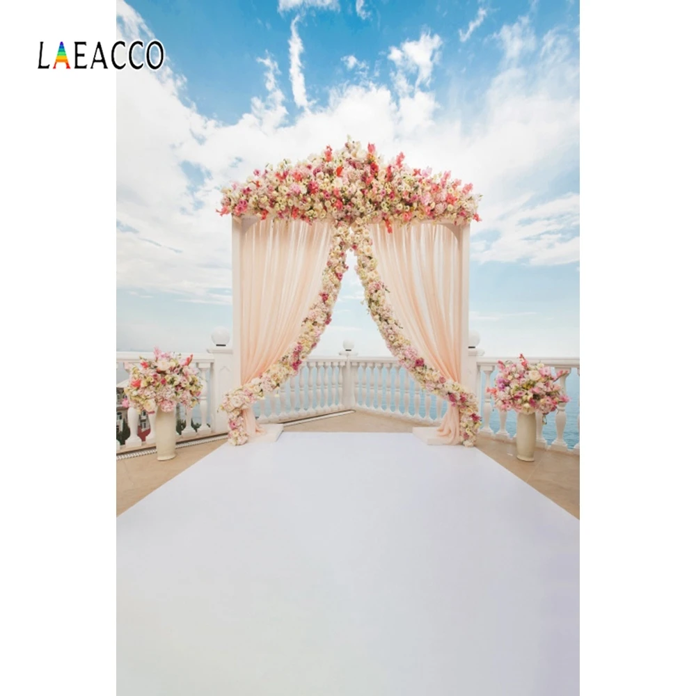 Laeacco Свадебный Фотофон голубое небо белые облака парапет розовый занавес цветы фон для фотосъемки