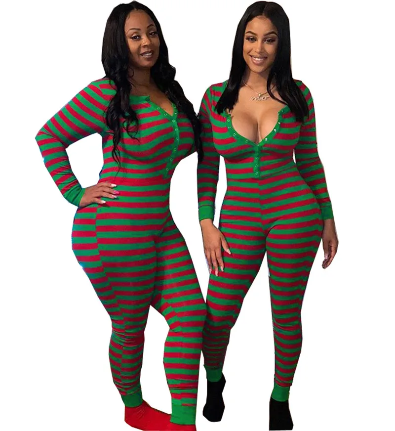 Осенне-зимний женский Облегающий комбинезон в полоску, комбинезоны, рождественские домашние пижамы, цельная Женская рождественская одежда для сна, комбинезон, одежда для сна