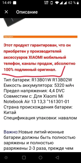 Осторожно! Обман! Батарея не оригинальная! Уже не первый пишу что она не оригинал, я допустил невнимательность и заказал. Батарея не держит заряд, уже две недели пытаюсь "раскачать". Результат- работает час и вырубается, нету даже экономного режима! просто вырубается! Открыл спор потому что везде написано что это оригинал, а на самом деле нет! Предоставил доказательства, в компенсации Али отказал. Нет не денег не товара. Сплошной обман.