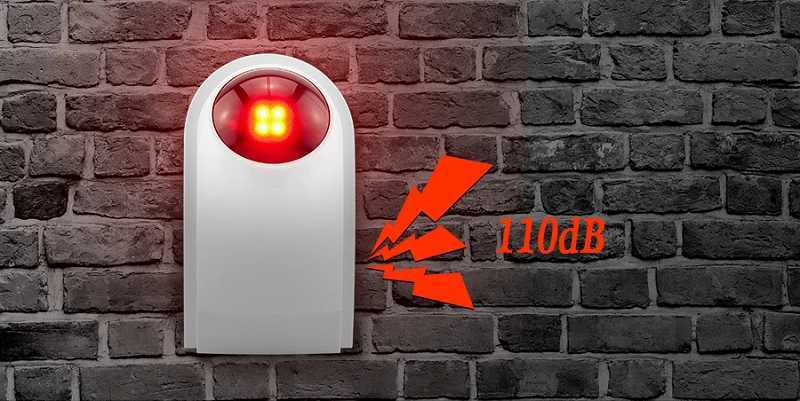 Может выслать 110 дБ (+ 3 дБ или-3 дБ) звуковой сигнал и встроенный светодиодный фонарик, когда система сигнализации