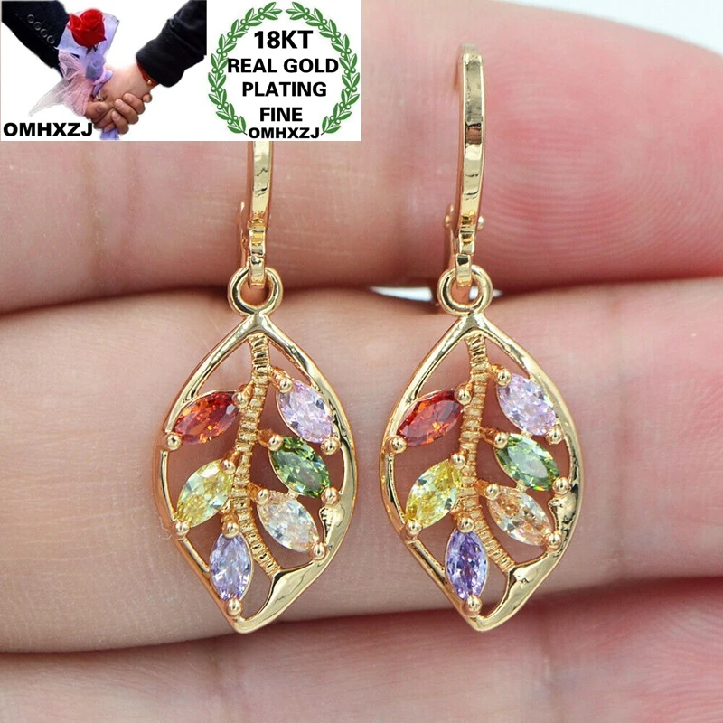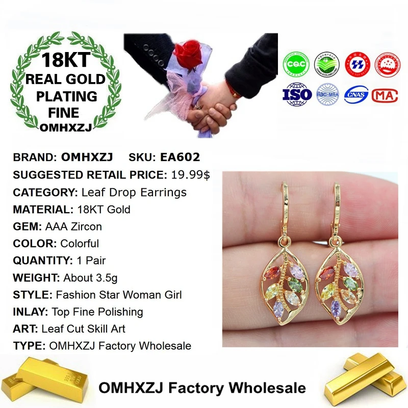 OMHXZJ оптовая продажа EA602 Европейская мода для женщин и девочек, вечерние, подарок на день рождения, свадьбу, цветные, с листом, AAA, циркон, 18KT, золотые висячие серьги