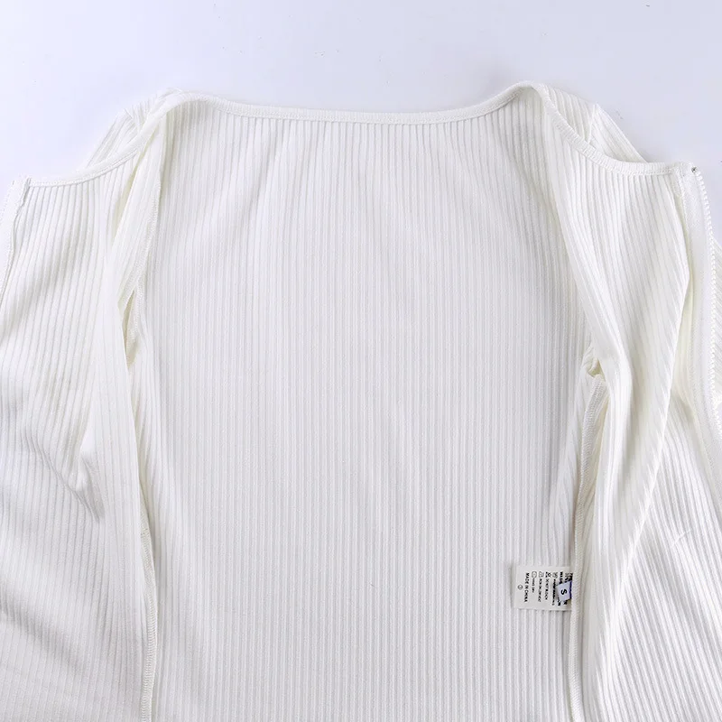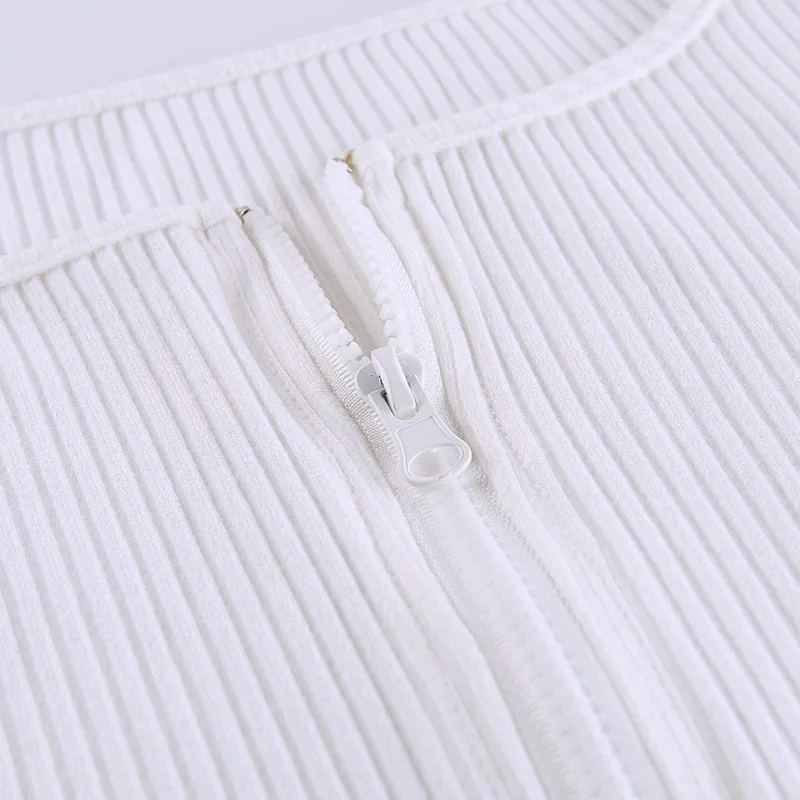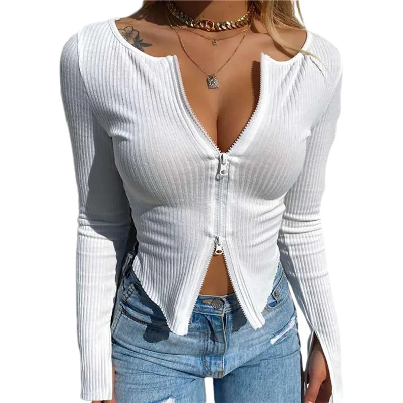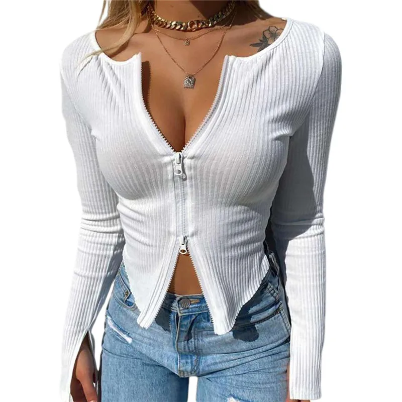 Топ женский трикотажный в рубчик, на молнии спереди, с длинным рукавом и V-образным вырезом