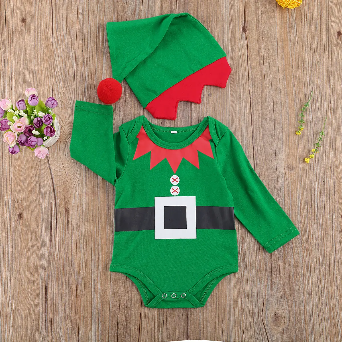Рождественские наряды для новорожденных; Комбинезон с длинными рукавами и круглым вырезом + шапочка с помпоном; Рождественская Одежда для маленьких девочек и мальчиков