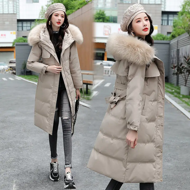 2021 Новая модная зимняя куртка для женщин пояс с большим мехом на капюшоне пуховая женская куртка на меху X длинное пальто зауженный крой теплая зимняя верхняя одежда для девочек