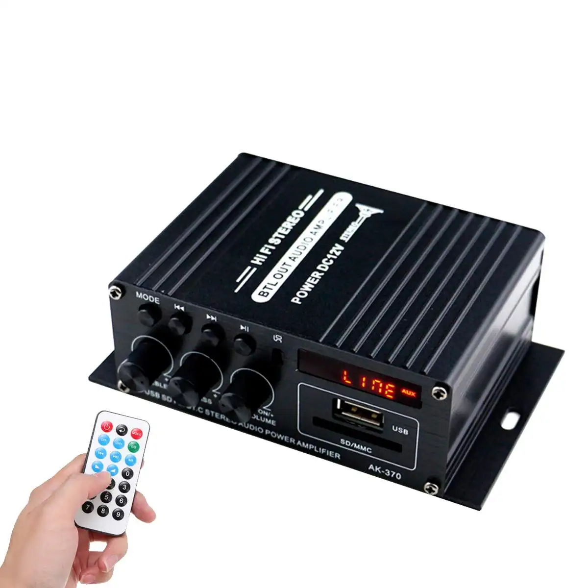 Особенности: -Мини HIFI Цифровой bluetooth аудио усилитель мощности. -Корпус из алюминиевого сплава, прочный, корпус изготовлен из алюминиевого сплава один раз, обработка поверхности анода, общая атмосфера, толстая, также очень хорошая. -Для sd-карты, u-диска, входа AUX, воспроизведения формата MP3, поддержка беспроводного подключения bluetooth. -Поддерживает fm-стерео радио. -Низкое Искажение обеспечивает более четкий, сильный и мощный звук. -С функцией дистанционного управления. -Два выхода основного канала. -Устройство поддерживает работу bluetooth и поддерживает линейный вход.
