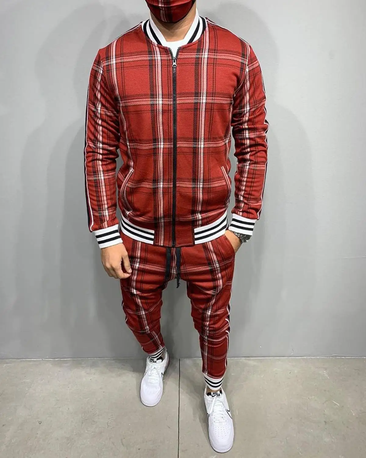 Мужской Клетчатый спортивный костюм с курткой и воротником-стойкой