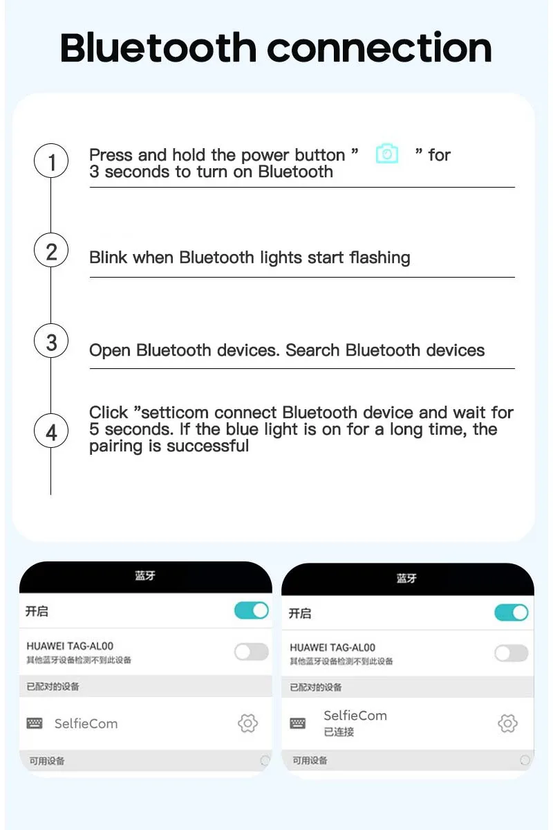 4. Нажмите «SelfieCom» для подключения к устройству Bluetooth, и синий светильник включен, чтобы указать успешное сопряжение.