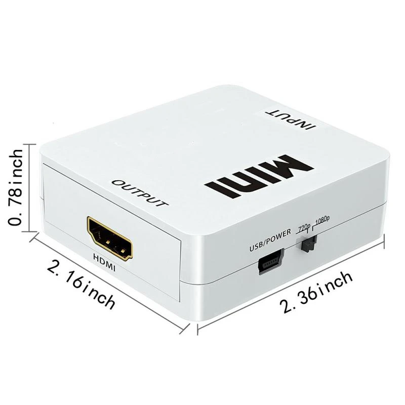 1. Входные порты: 1xrca (желтый, белый, красный), USB питание2. Выходные порты: 1xHDMI (стандарт)3. Совместимость NTSC/PAL4. Композитный вход: PAL, NTSC3.58, NTSC4.43, SECAM, PAL/M, PAL/N5. Выход HDMI: 1080p/60 Гц, 720p/60 Гц6. Размеры (мм): 66(D)x55(W)x20(H)7. Вес (г): 40 г8. Питание: порт USB