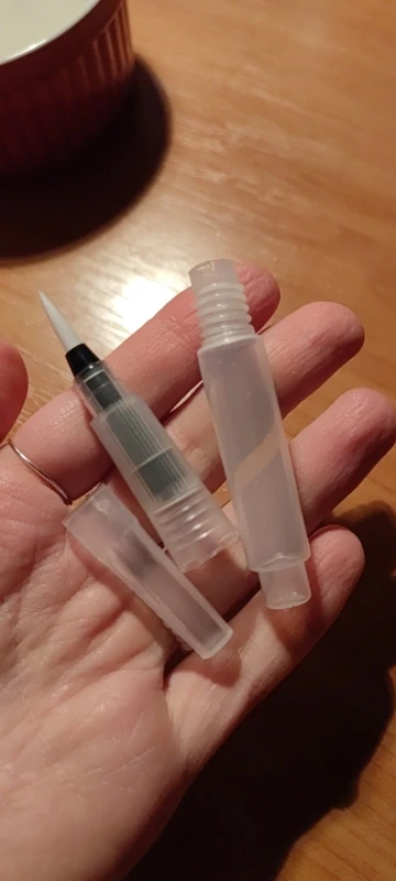 Кисточка-малышка Как дорожный вариант, вообще идеально. Кончик делается тоненьким, достаточно мягкий ворс кстати. Мягче, чем похожая кисть из набора акварели, которая у меня есть. Интересно, что раскручивается она в обратную сторону, не стандартно) Рекомендую ✨
