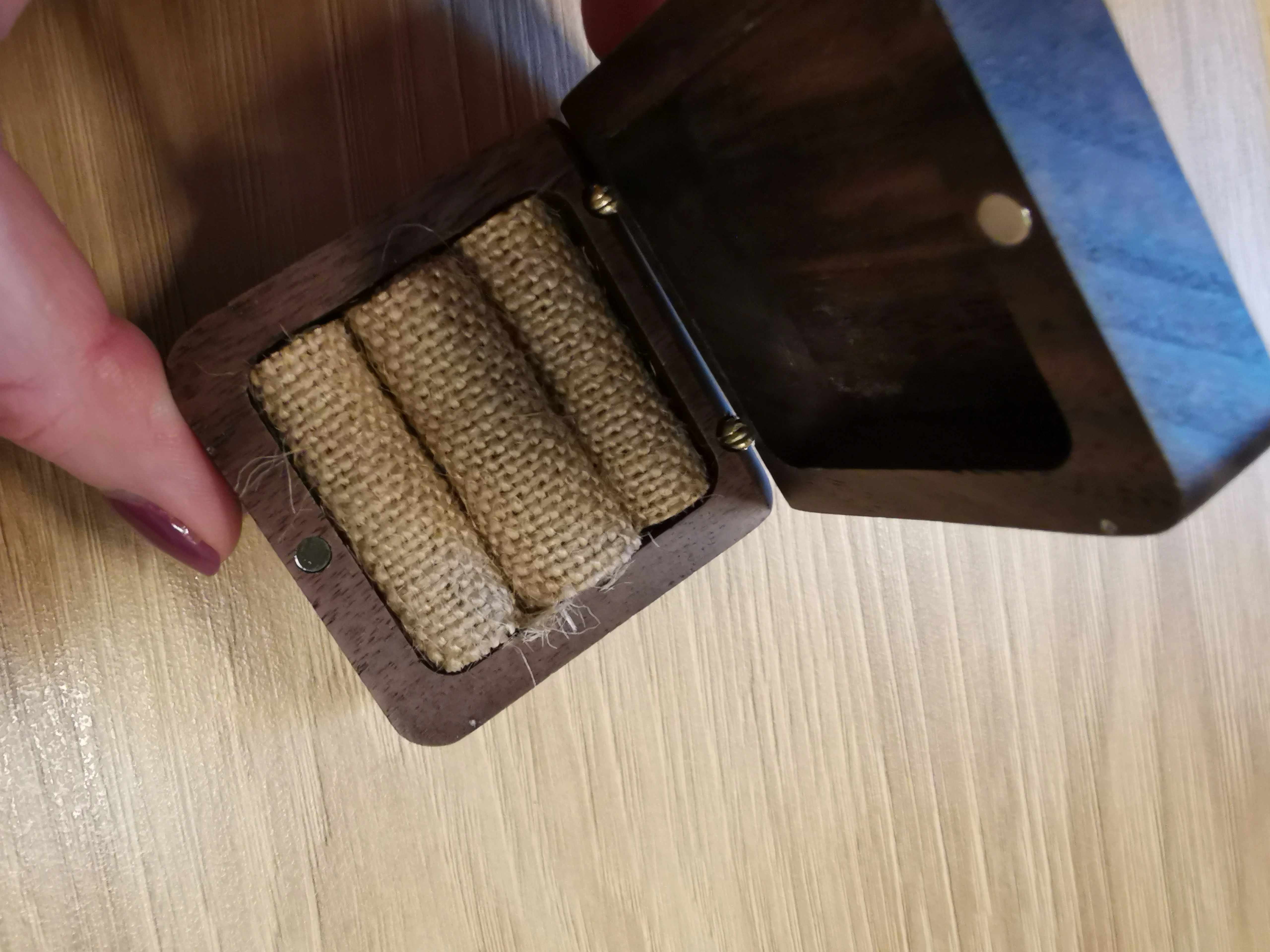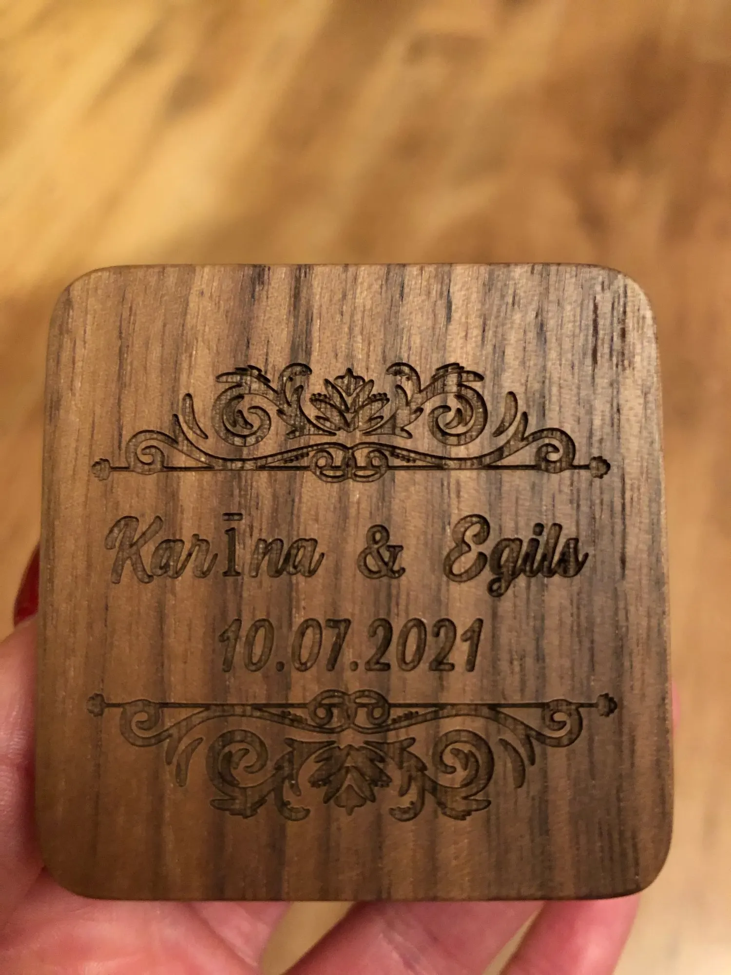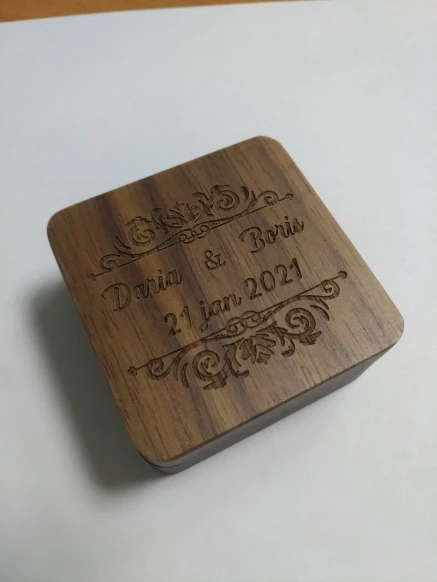 Заказывала во время нового Года, отправка была долгой . Но пришло очень быстро. Надпись выполнена качественно, без ошибок , шкатулка деревянная , внутри удобная плотная сеточка, сложённая для колец. Заказом очень довольна !
