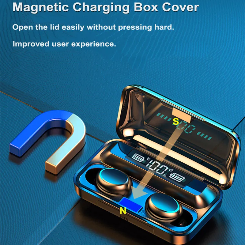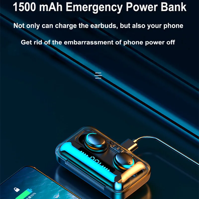 Feature -True wireless stereo, HIFI sound. -Supports Binaural Calls -Both the left and right ears have full Bluetooth headset functionality and can be used individually or in pairs. -Dual mode Bluetooth 5.0, ultra low power consumption. -Bluetooth transmission distance: 10 meters barrier-free. -Listening to song time: about 4-5 hours Note Support Dropshipping/Wholesales, If you need it, you can contact the seller. F9 series products can be used as mobile power to charge mobile phones Product pictures