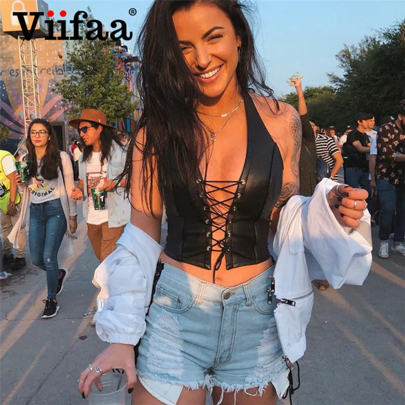 Сексуальная черная женская блузка из искусственной кожи с открытой спиной, с завязкой спереди