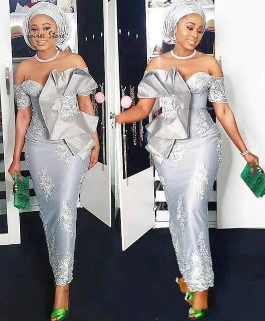 Aso Ebi Серебряные вечерние платья-русалки длиной до щиколотки с коротким рукавом нигерийское Африканское кружевное платье для выпускного вечера с большим бантом юбки для вечеринки 2020