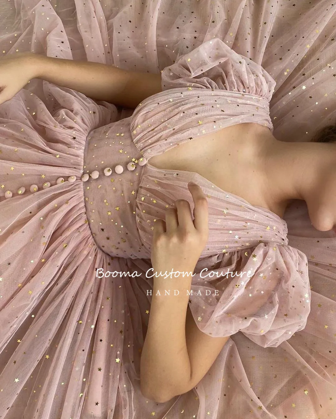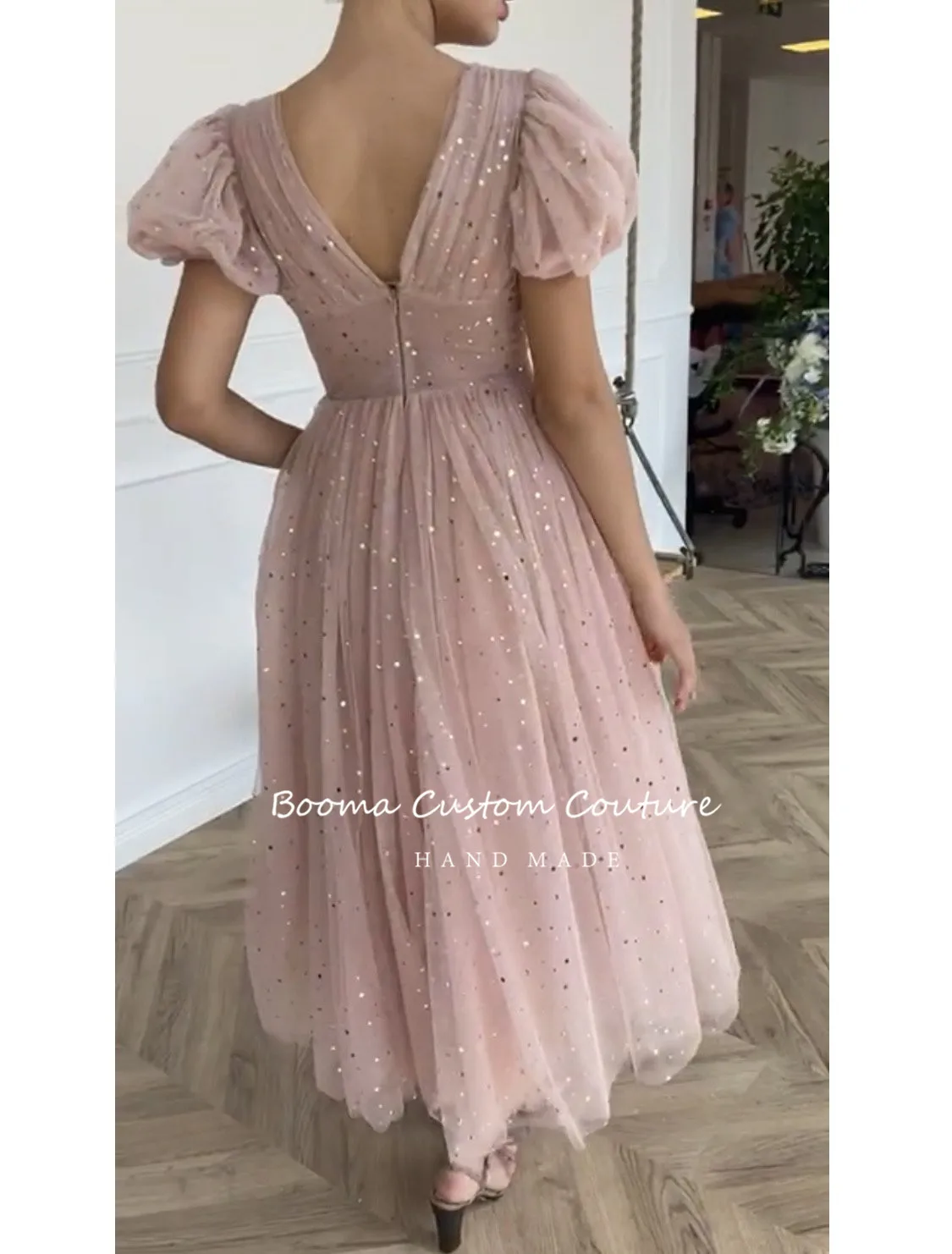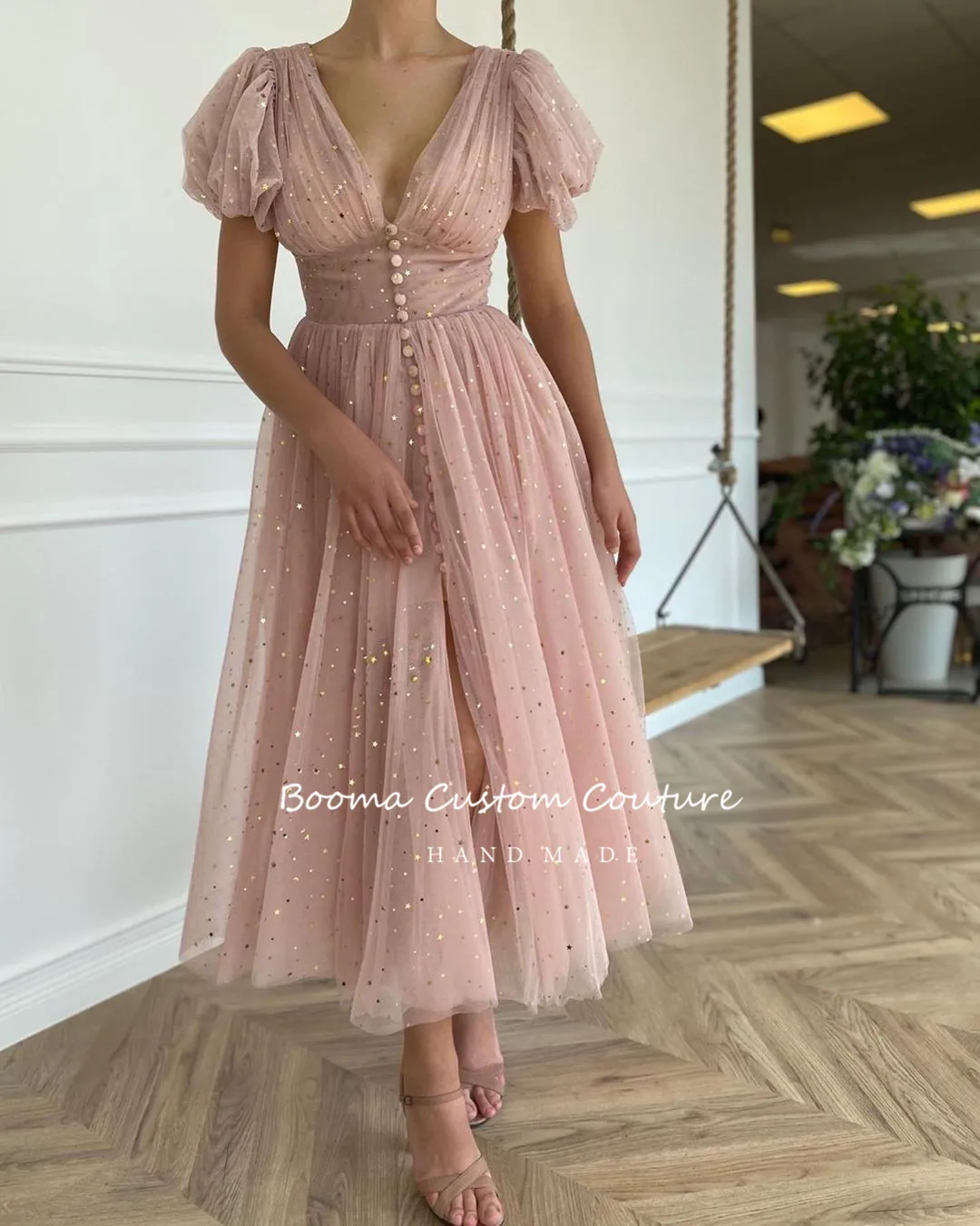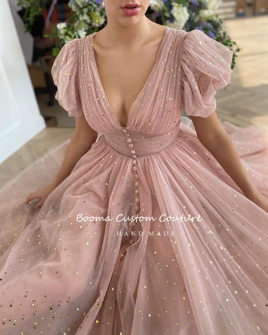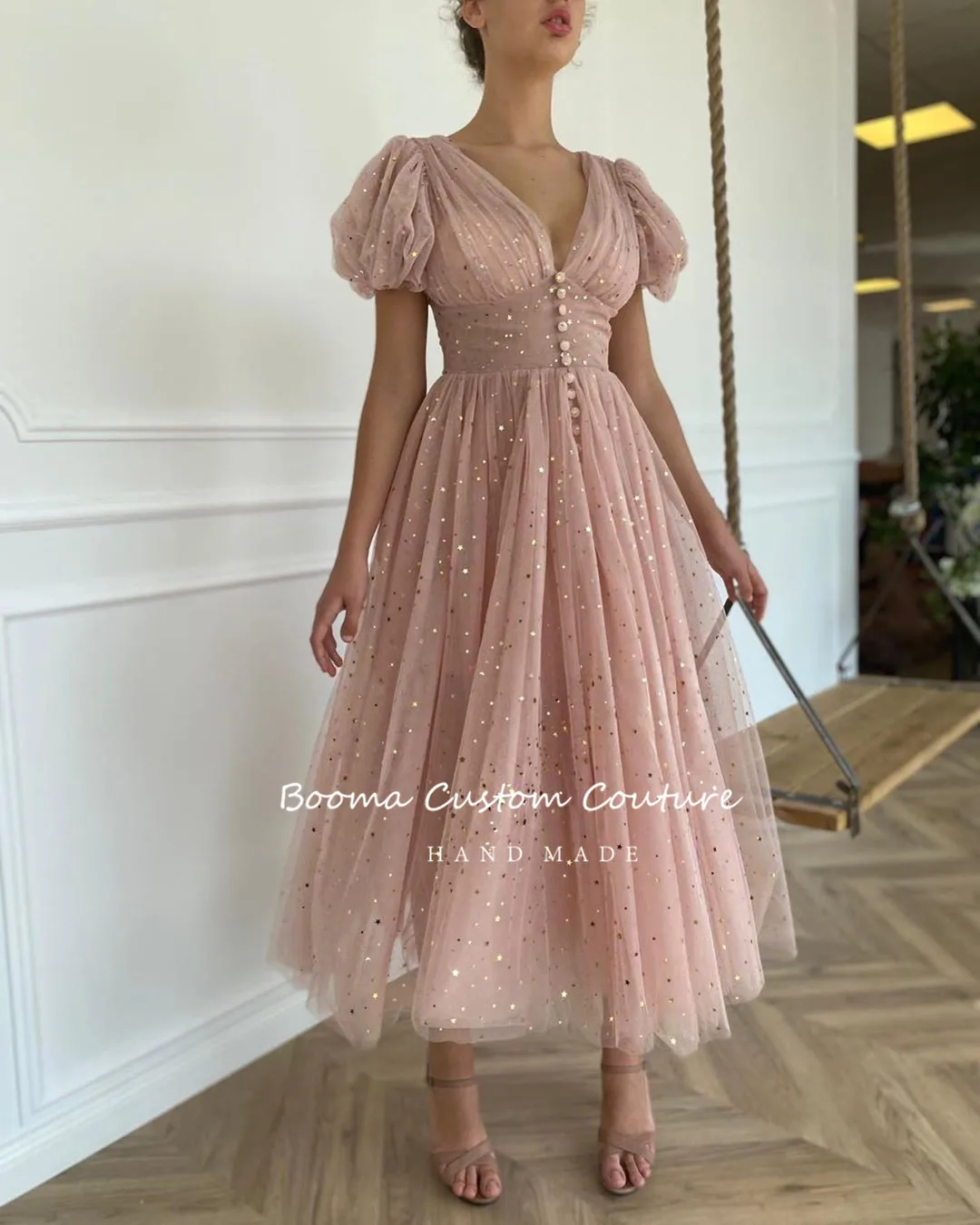 Блестящие короткие платья для выпускного вечера, с V-образным вырезом, пышными рукавами, плиссированные тюлевые вечерние платья, пуговицы, трапециевидные платья для вечеринки