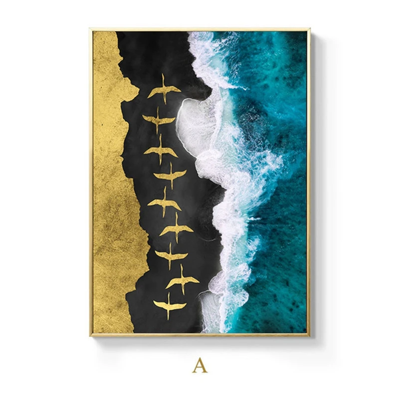 Абстрактная живопись, Золотой океан, волны, холст, пейзаж, плакат, морской пляж, морской пейзаж, современный холст, настенное искусство, украшение, картина