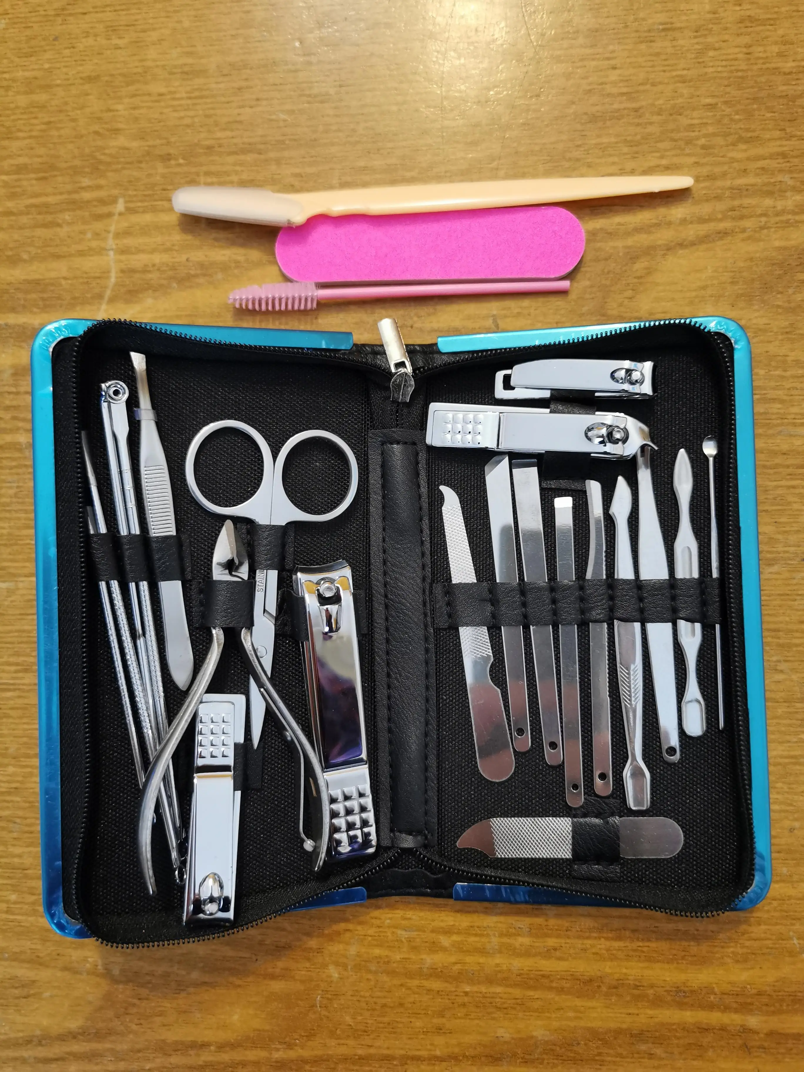 26 предметов, выглядит симпатично. В подарок положили двустороннюю точильную пластину для ногтей, небольшую пилку-скребок и кисточку.
