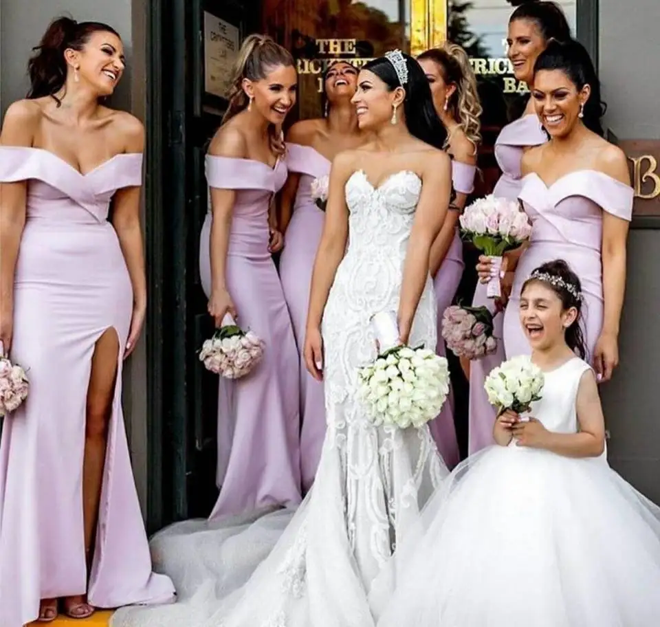 Элегантное Длинное атласное платье подружки невесты трапециевидной формы с открытыми плечами и щелевой фонарь фиолетового цвета на заказ на шнуровке