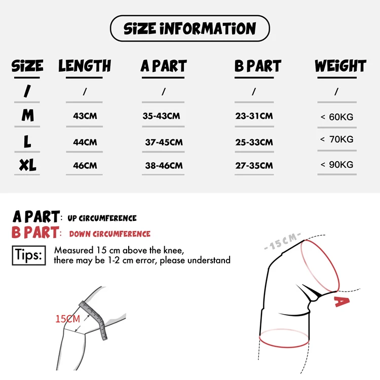 M -- бедра 35-43 см, обхват икры 23-31 см, Длина 43 см рекомендуемый вес <60 кгL -- бедра 37-45 см, обхват икры 25-33 см, длина 44 см, рекомендуемый вес <70 кгXL-Бедро 38-46 см, обхват голени 27-35 см, длина 46 см рекомендуемый вес <90 кг