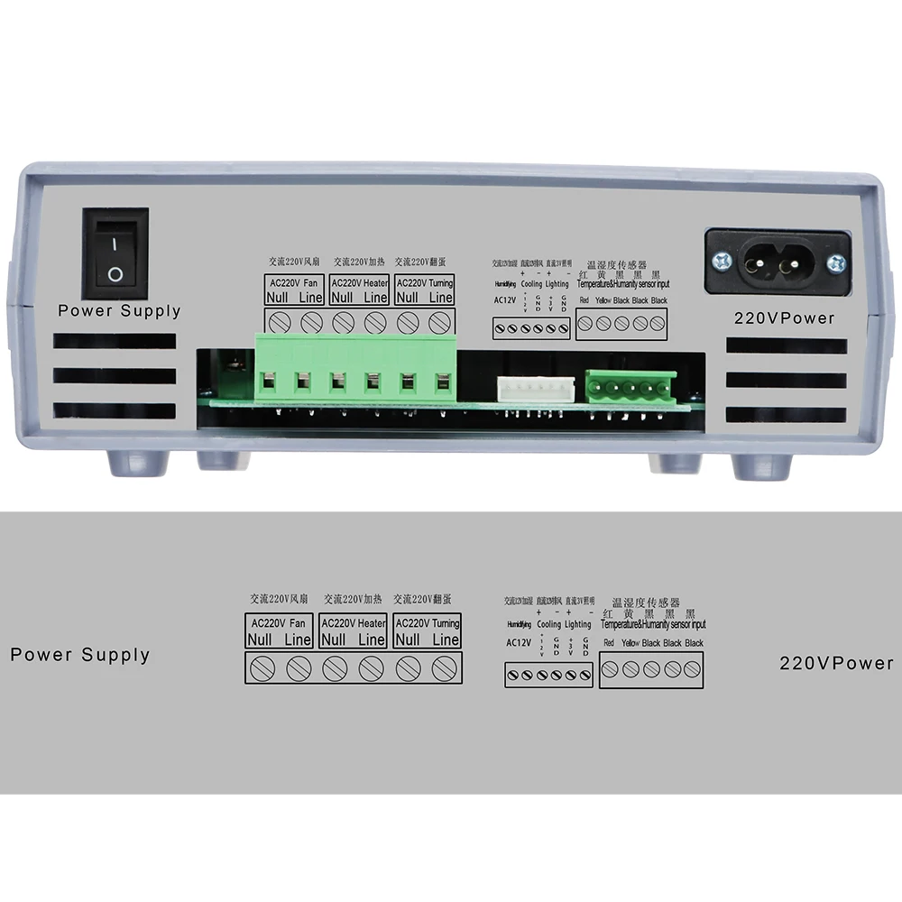 Выходной ток: нагрев AC220V/8A, вентилятор AC220V/5A, поворот яиц AC220V/5A, увлажнение AC12V/0.2A, охлаждение DC12V/0.4A, светильник DC5V/0.1A
