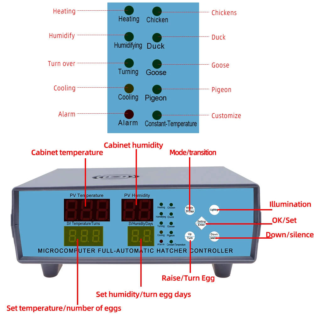 Интеллектуальный контроллер инкубатора нового поколения-это полностью интеллектуальная система управления микрокопутером, разработанная и разработанная для инкубационной промышленности, которая применяет новейшие микроэлектронные технологии и компоненты нового типа. Он применяет новейшие микроконпутерные чипы, чтобы иметь сильные анти-помехи и высокую стабильную производительность; Датчик тепературы применяется Высокоточный датчик обеспечивает высокую точность сбора и широкий диапазон температур; Он применяет высокоэффективный датчик влажности для высокой точности, чтобы эффективно обеспечить стабильность и надежность. Он имеет дизайн удобных для пользователя четырех экранов для дисплея, включая два screns, отображающих температуру и гумисти Инкубатора и других экранов, показывающих время поворота яиц и инкубационные дни, нажав на клавиши и отображая заданную тепературу и влажность, нажав на клавиши. И пять видов инкубационных режимов для пользовательского определения, курица, утка, гусь и голубь доступны для Выбор.